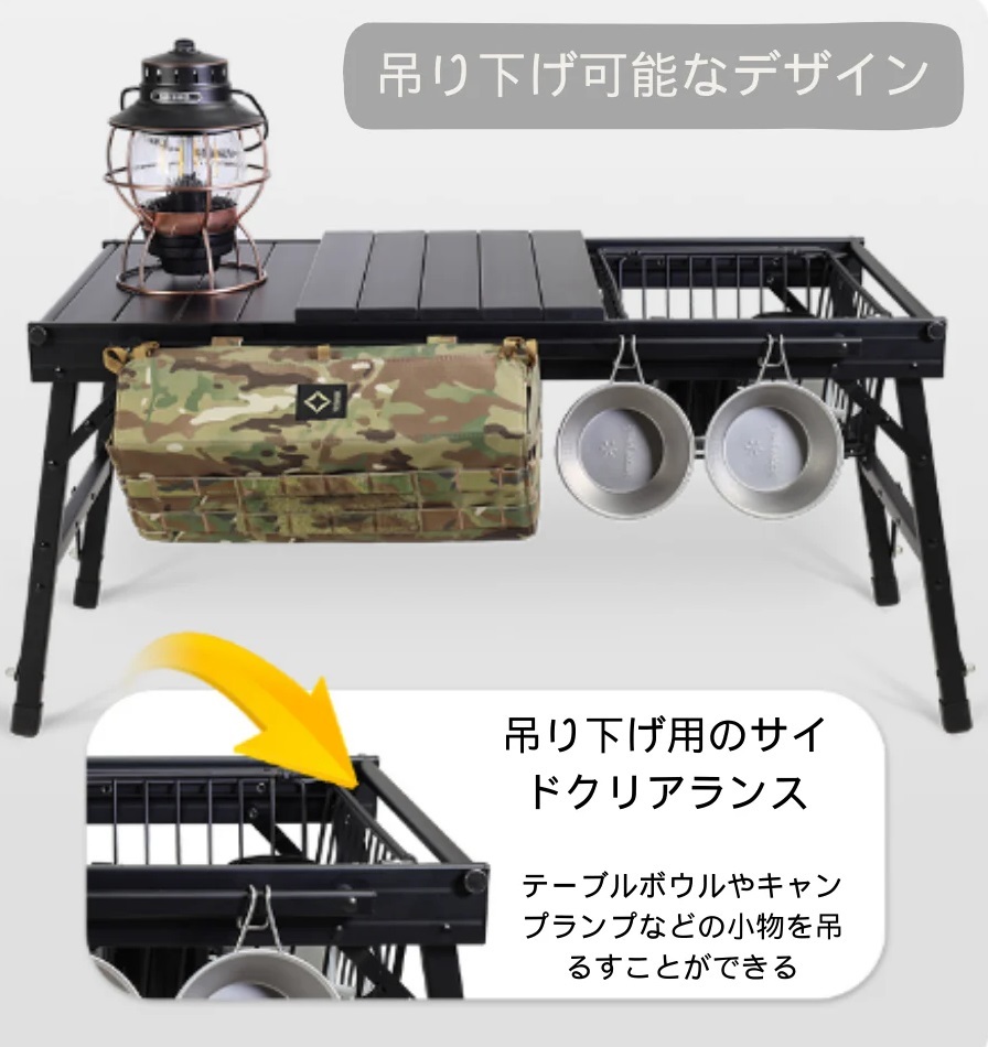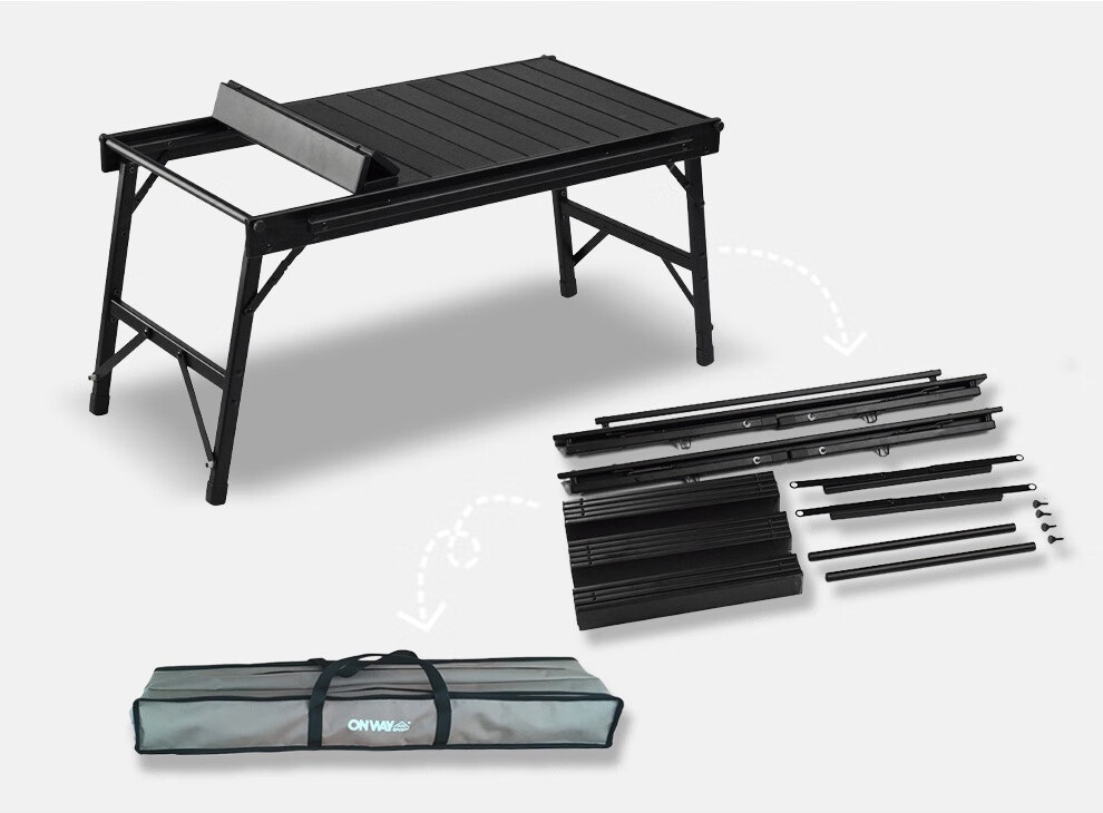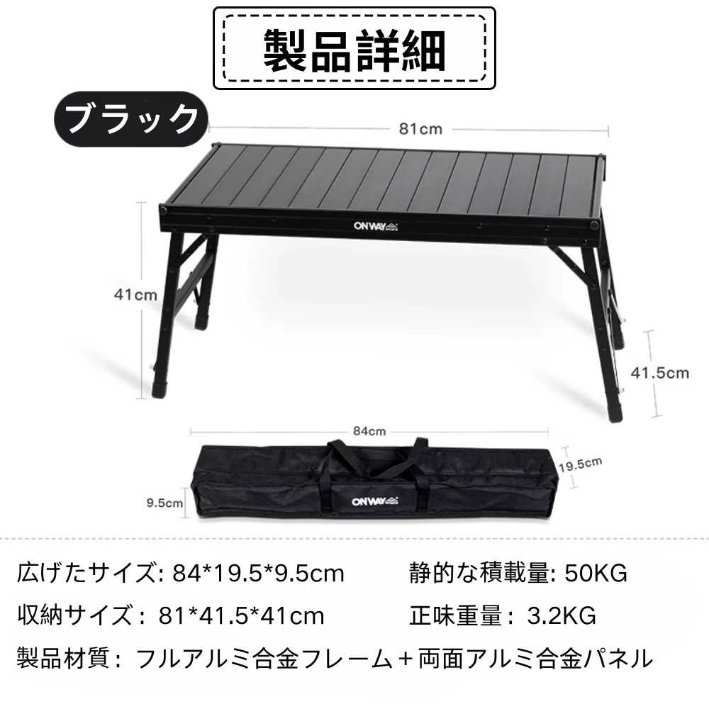 | ★ONWAY SPORTS フォールディングアルミウッドローテーブルOW-8242ブラックになります。ロータイプのテーブルになります。各パーツの作りこみや仕上がりはワンランク上のアウトドアブランドになります。★ ★組み立て式のテーブルで各パーツが細かく分かれており小さくまとめて収納ケースに入りとても便利です。見た目はウッド素材に見えますが手に触れるまで分からないくらいの仕上がりで実際にはアルミ素材で制作されており軽くて持ち運びが出来とっても便利です。★ ★簡単組み立て&収納で慣れれば3分ほどで展開します。上品ない色目でワンランク上のローテーブルになります。サイドにはスタッキングカップ等が掛けれるようになっておりトングや炭ばさみ等も掛けて頂けます。天板は3つに分かれておりそのうちの天板1点を外せば使用するグリルやストーブなどを地面に置いてテーブルの真ん中などに設置出来る仕様になっております。各天板はショックコードで繋がっておりますがコードを切ればテーブルに合わせたい大きさに天板を取ることが出来お持ちのパーツなどの設置が可能です。★ ★様々な場所に対応でき車の中、バイクの荷物に常備しておいてもかさばりません。シンプルなデザインで室内でもおしゃれに、もちろん野外でもゆったり。キャンプ、登山、釣り、野外フェス、運動会、BBQ、ピクニック、などシーンを選ばず、いつでもどこでも大活躍。★ | |||