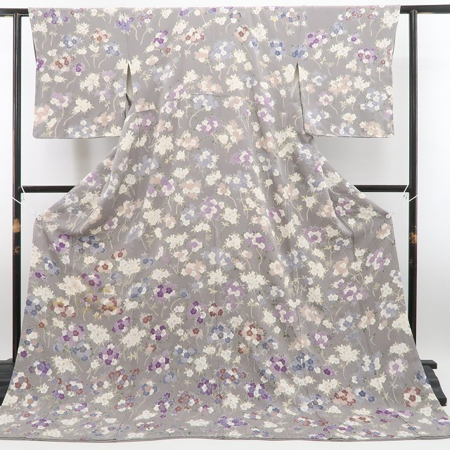 こちらのお着物は、ソフトトーンの彩色で染めの美しさにフォーカスしたデザイン性の高い花刺繍を込めています。緻密にして過飾にならず、さりげなくセンスの良さを表現するのに最適なお召し物です。