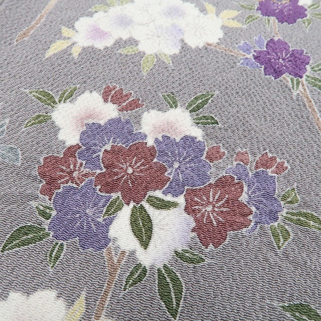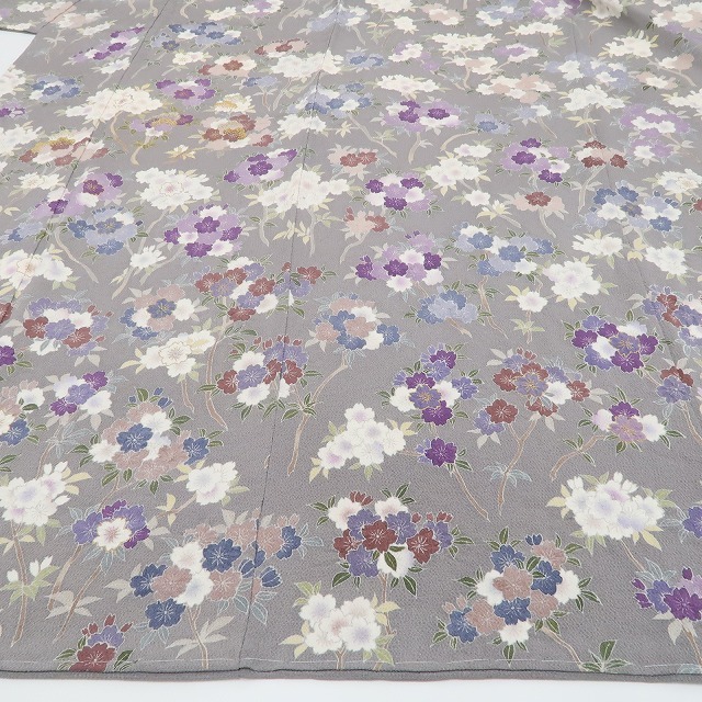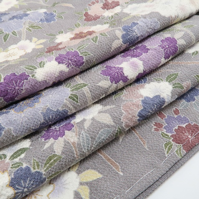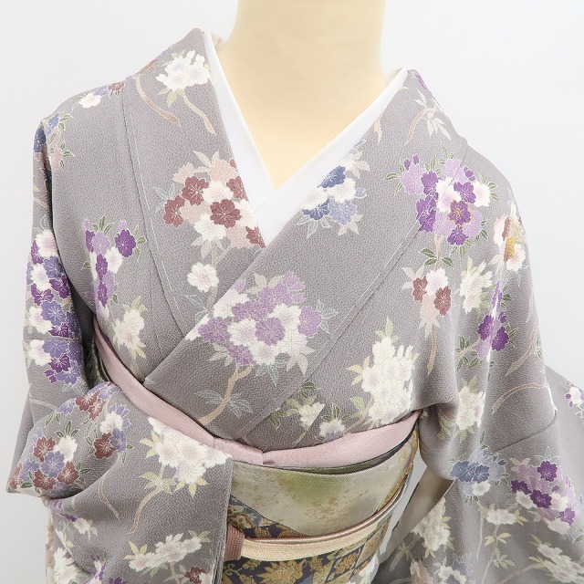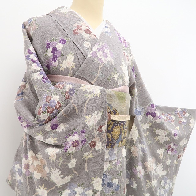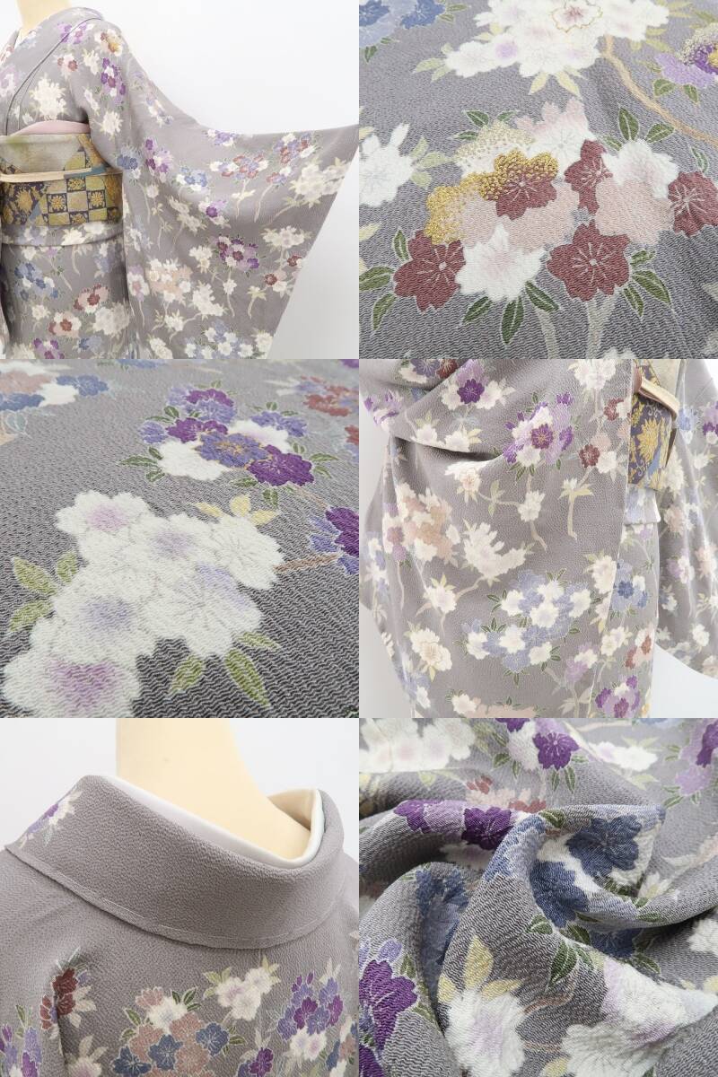 趣ある桔梗鼠色の彩色が誘う心地よい温もり、全面に可憐な表情で描き込まれた桜や小花のデザインモチーフ、そして精微な相良刺繍が照らし出すこの上ない高級感、それは正に“貴女を照らす季節の陽光”、“取って置き”の一枚はこれで決まり!装いの満足度を届けてくれること間違いなし。