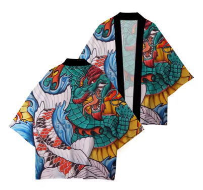 女性のための伝統的なプリント着物,日焼け止め,快適なカーディガン,柔らかい生地,ビーチや休暇用 色: 青 龍と鯉 サイズ:XL
