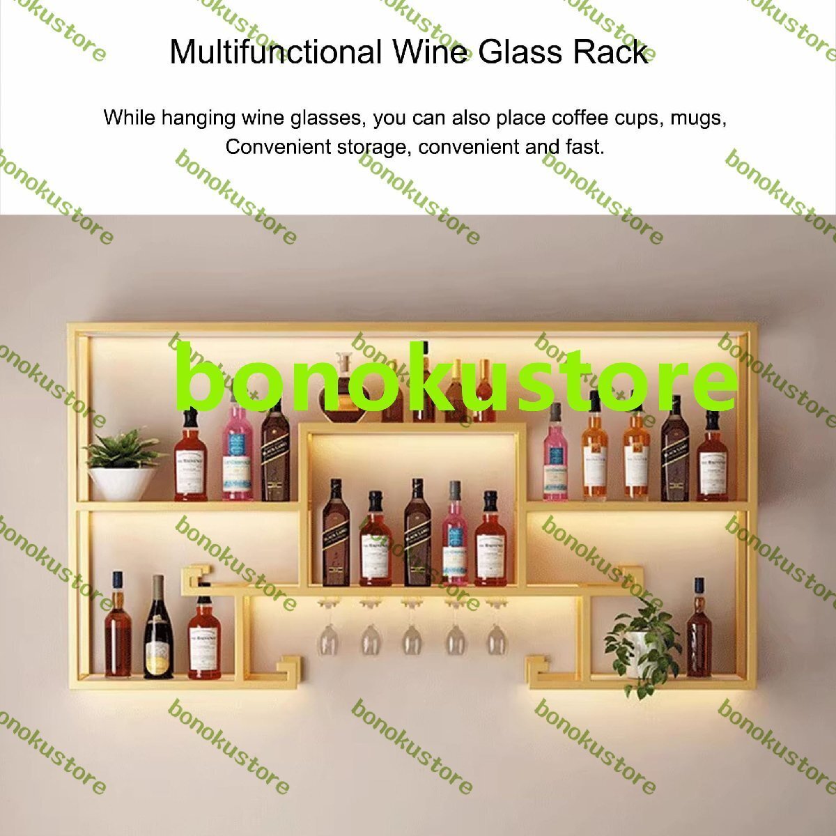 ボトルラック メタルワインラック バーシェルフ 壁掛け式 吊り下げ式ワイングラスホルダーラックとLEDライト付き 酒瓶ディスプレイ棚ラック カウンタートップフローティングバー ミニバーキャビネット ホームバー用