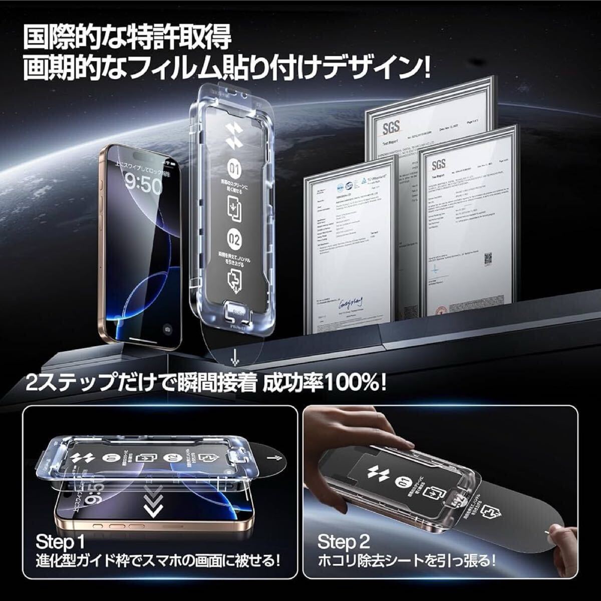 【初心者でも簡単!画期的なフィルム貼り付け】2ステップで進化型ガイド枠を使用し、ズレや気泡、ホコリの心配なし。いPhone 16 Pro Maxに最適な強化ガラスフィルムで、失敗を大幅に減少させます。