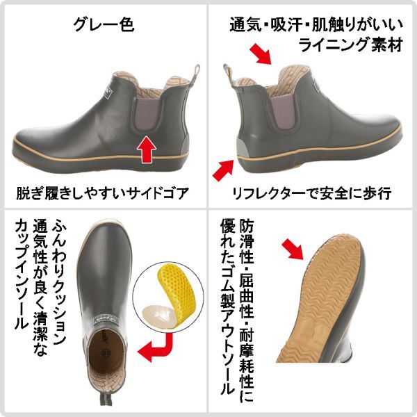 天然ゴム素材を甲材/底材に使用しており、耐摩耗性・耐屈曲性・耐候性に優れた雨靴です。
