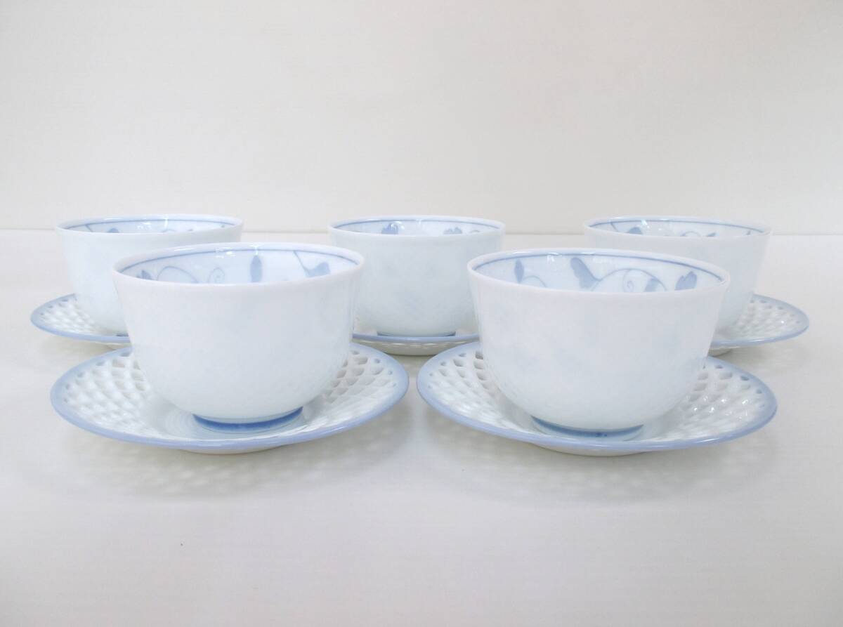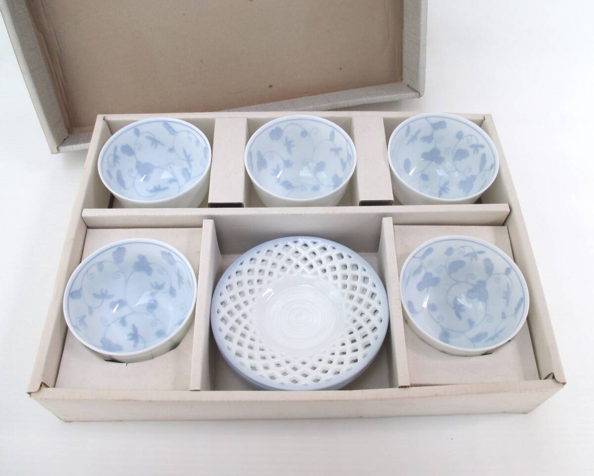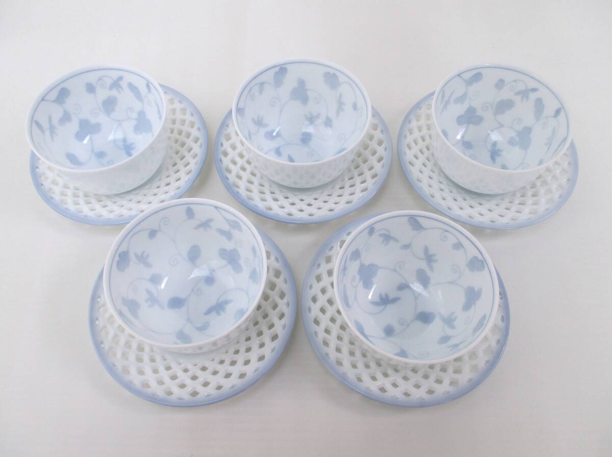 未使用 彩堂窯 唐草茶碗付煎茶揃 湯呑み 5客セット 京唐草/透かし彫り/湯呑/茶托