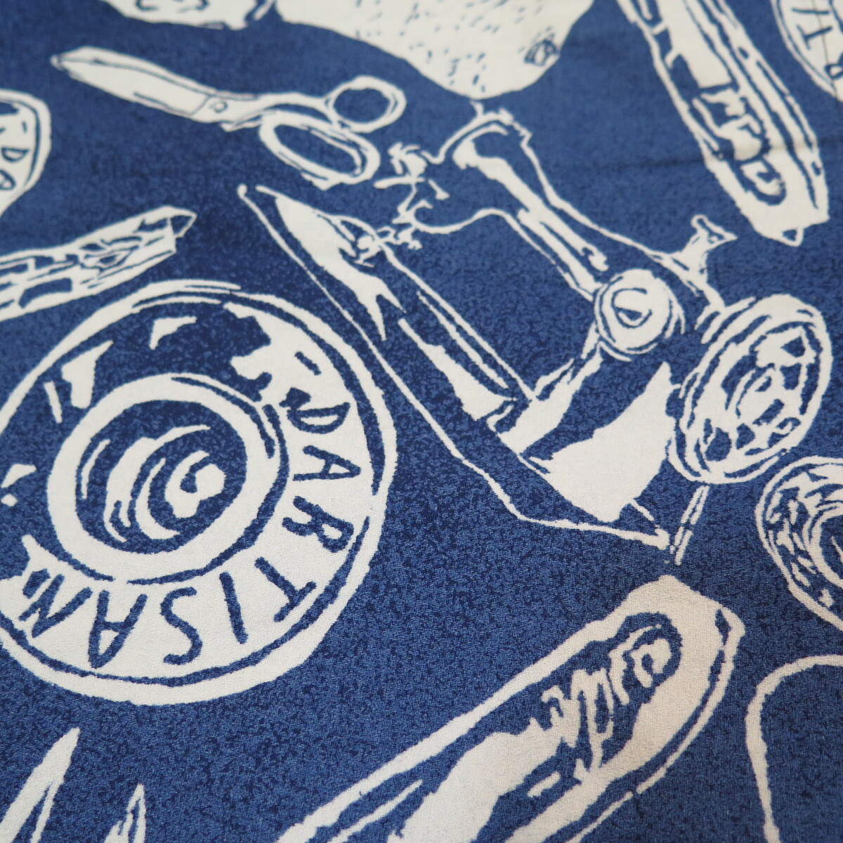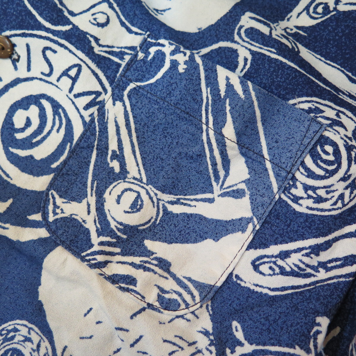 版画の手刷り風に仕上げたインディゴ抜染アロハシャツ。