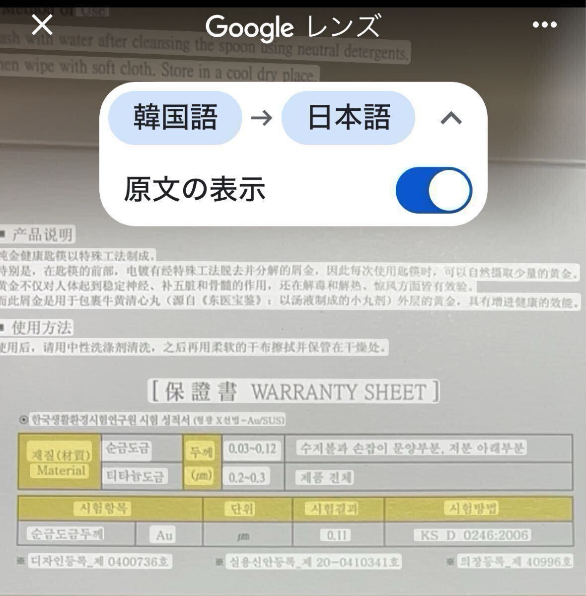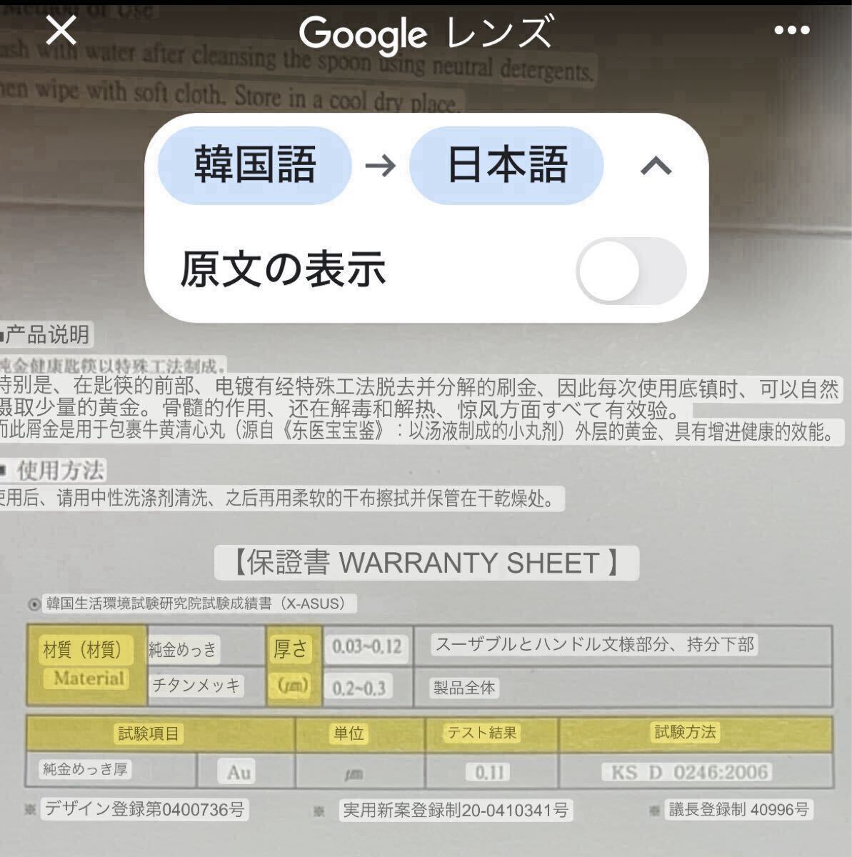 純金メッキの保証書付き。保証書の原本と翻訳の両方を載せていますので、ご確認ください。