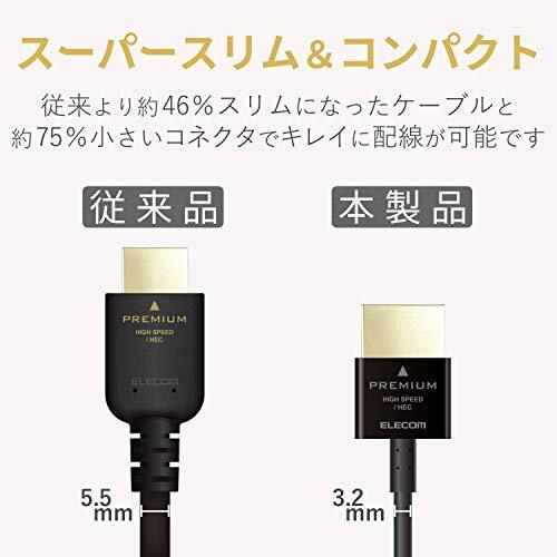 「エレコム HDMI ケーブル 1.5m プレミアム 4K 2K (60P) HDR スーパースリムコネクタケーブル仕様 ブラック DH-HDP1」▼4549550102155▼(商品説明)1.5mブラック/1.5m/DH-HDP14SS15BK・Size:1.5m・パッケージ個数:1・18Gbpsの高速伝送で高画質映像と音声を忠実に伝送できるPremium HDMI cable規格認証済みイーサネット対応Premium HDMIケーブルの超スリムタイプです。・従来品に比べ約46%スリムな3.2mm超スリムケーブルを採用し、すっきりと綺麗に配線可能です。DH-HDPSシリーズとの比較・従来品に比べ約75%小さい一体型シェル小型コネクタを採用しています。DH-HDPSシリーズとの比較・4K2K(60P)に対応し、滑らかな高解像度映像を伝送可能です。・明暗差を活かした立体感のある映像を伝送することができるHDRに対応しています。18Gbpsの高速伝送で高画質映像と音声を充実に伝送できるPremium HDMI cable規格認証済みイーサネット対応Premium HDMIケーブルの超スリムタイプです。