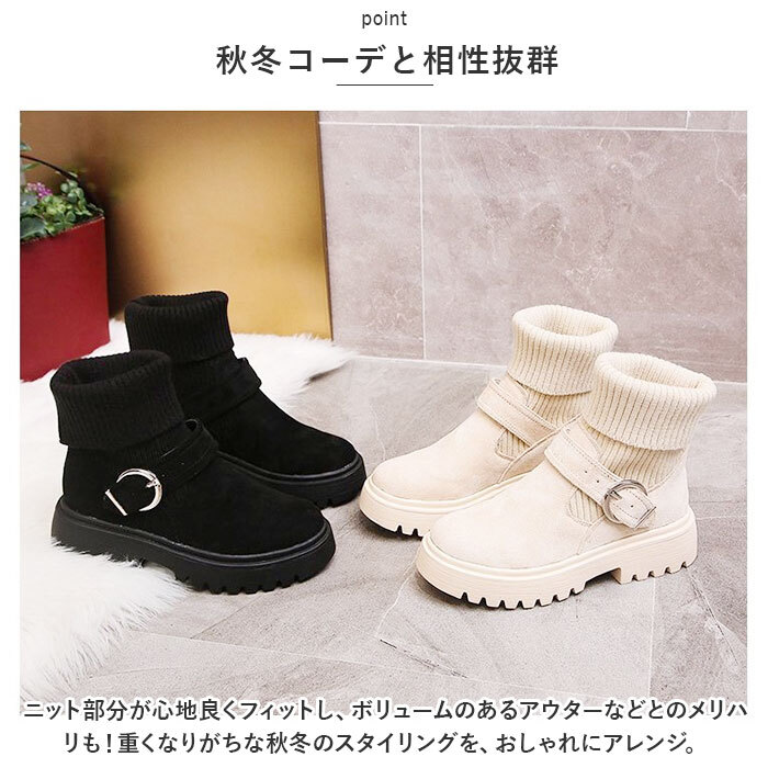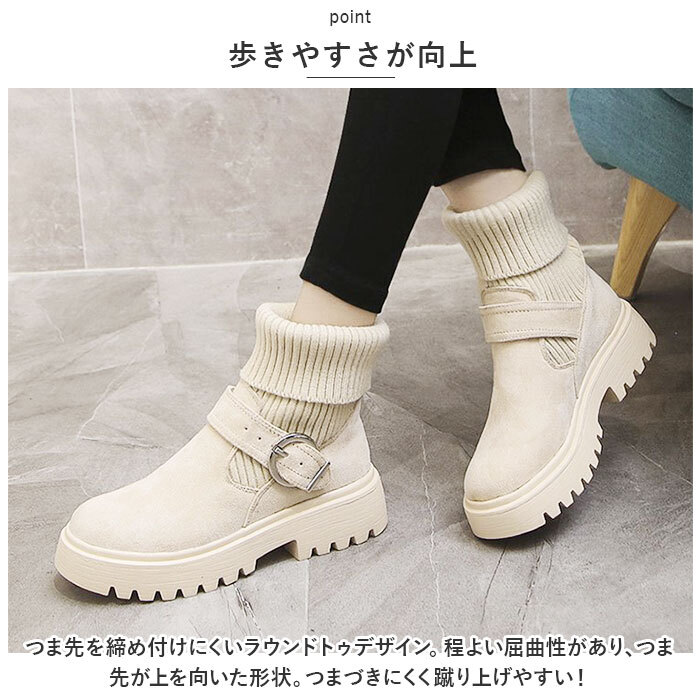 | 商品説明 | ・・トレンド感のある足元が完成☆おしゃれにキマる、ソックスブーツが新登場。 ・【ブーツとソックスが融合】 ・足首部分がソックスのように伸縮性のあるニット素材で作られた、ブーツとソックスのミックスデザイン☆足首にぴったりと添うことで、すらりとした印象に。 ・【秋冬コーデと相性抜群】 ・ニット部分が心地良くフィットし、ボリュームのあるアウターなどとのメリハリも!重くなりがちな秋冬のスタイリングを、おしゃれにアレンジ。 ・【足入れがスムーズ】 ・履き口の両サイドにニット素材を織り込んでおり、着脱がラクチン。 ・【歩きやすさが向上】 ・つま先を締め付けにくいラウンドトゥデザイン。程よい屈曲性があり、つま先が上を向いた形状。つまづきにくく蹴り上げやすい! ・【安定感のある歩行をサポート】 ・幅広ヒールで前後の差を抑え、歩きやすい厚底ソール。底面に凹凸を施し、濡れた路面でも滑りにくいのがポイント。 ・【ヘビロテ間違いなし♪】 ・フィット感を微調整できるベルトは、デザインのワンポイントに。カジュアルやストリートなど幅広いコーデにマッチし、デイリーユースにぴったり。 |