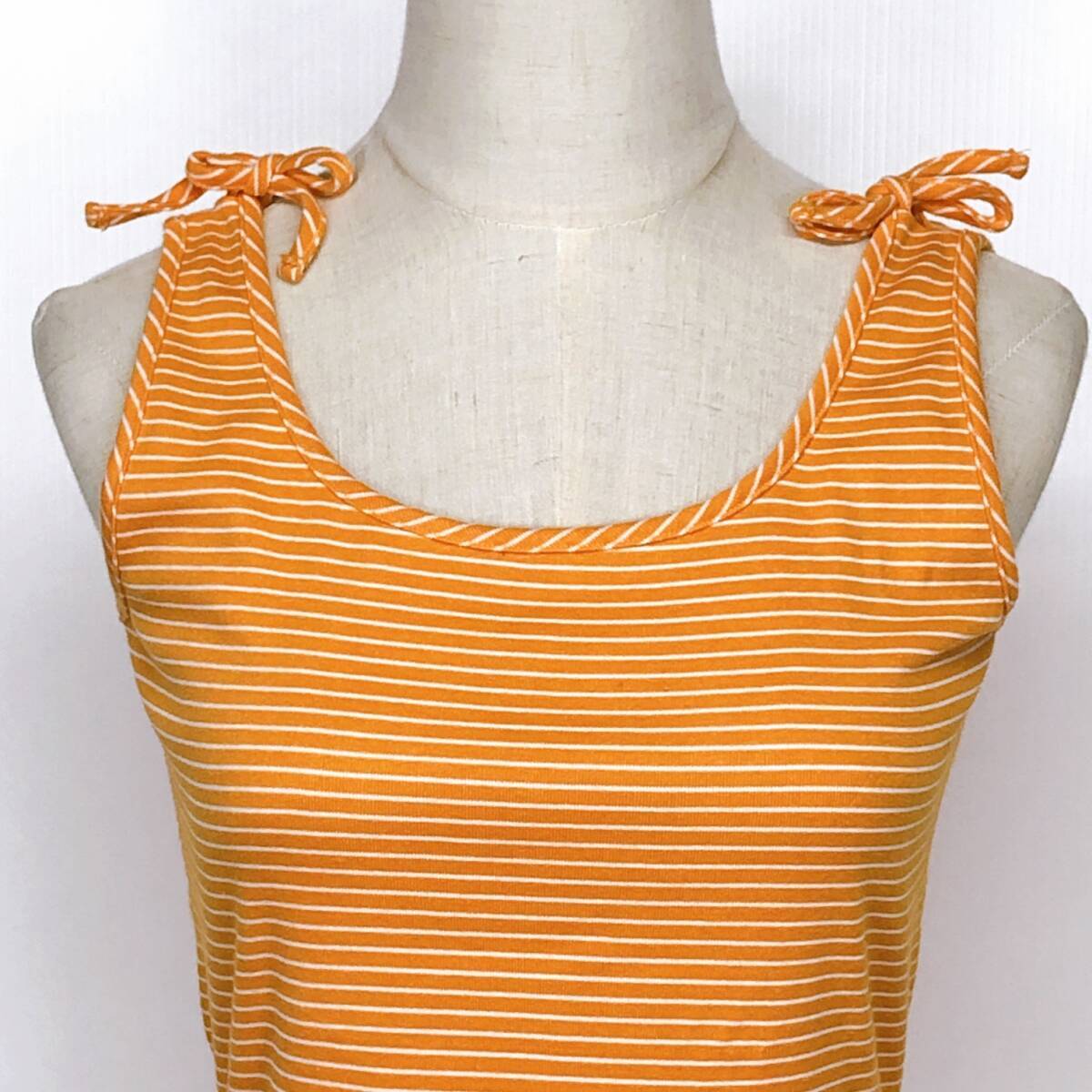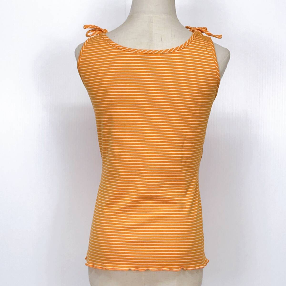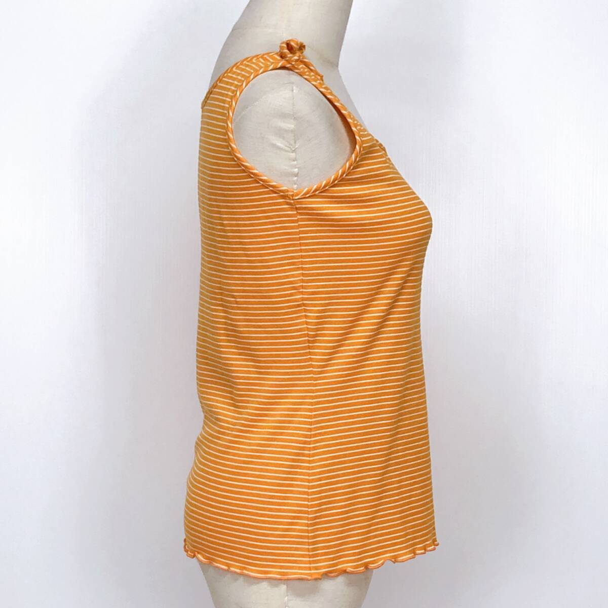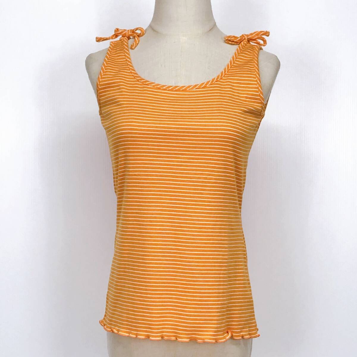 YX1216 美品 ELLEレディーストップスタンクトップ袖無し薄手 伸縮性 リボン オレンジ 橙 ストライプ 綿素材含 シンプル かわいい 涼しげ 夏