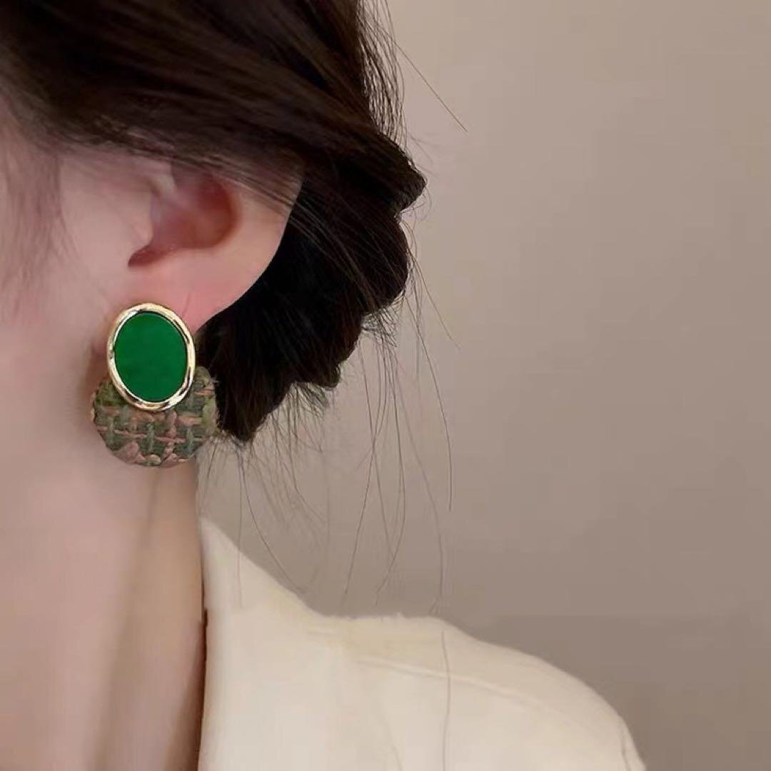 モダンでおしゃれなデザインが特徴的です。緑色の楕円形の部分は、光沢感があり、深みのある色合いが印象的です。ゴールドの縁取りが高級感をプラスし、エレガントな印象を与えます。