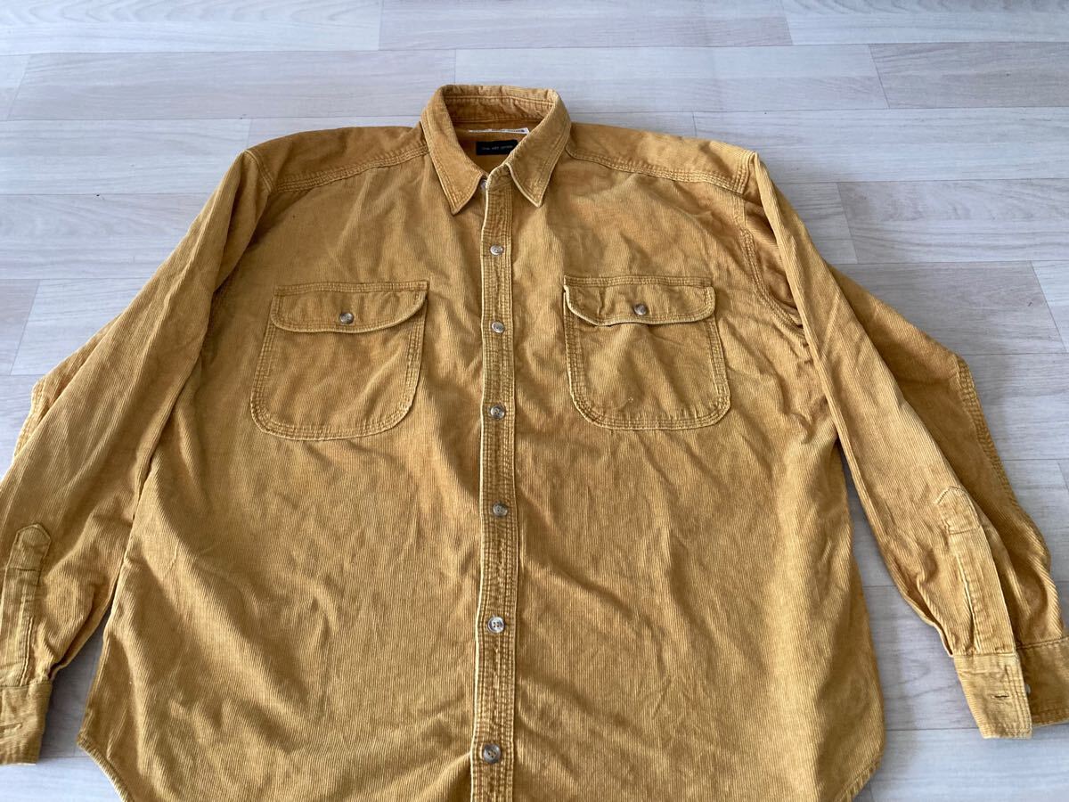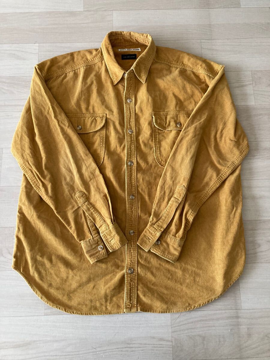 D.E.U.X.BATH PALIER コーデュロイ素材のマスタード色の長袖シャツ、前面に2つのポケット付き。