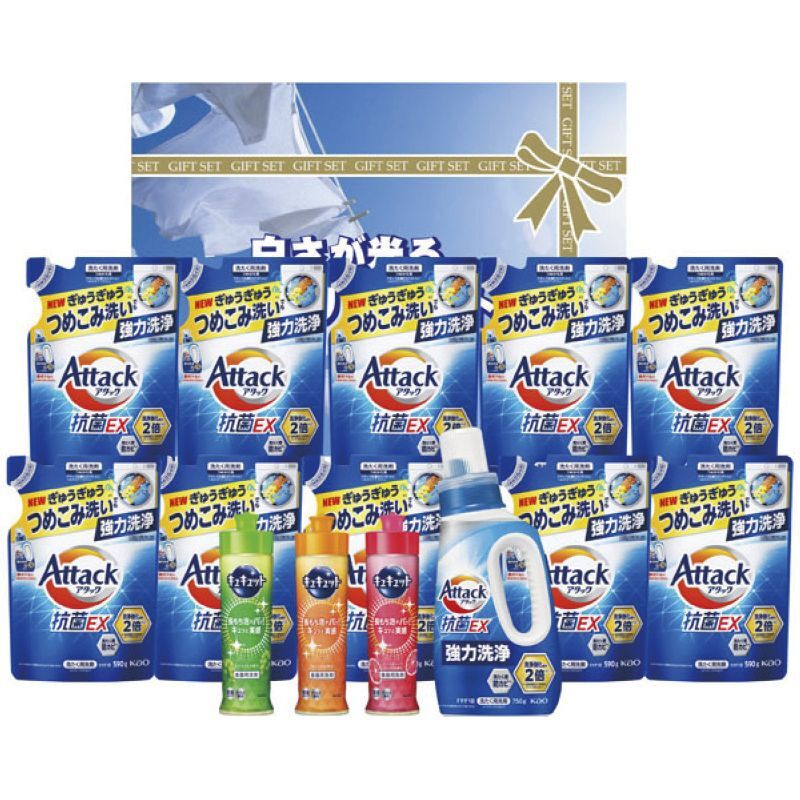 【セット内容】アタック抗菌EX詰替用(590g)×10、アタック抗菌EX(750g)・キュキュット(オレンジ・ピンクグレープフルーツ・マスカット)(各220ml)×各1