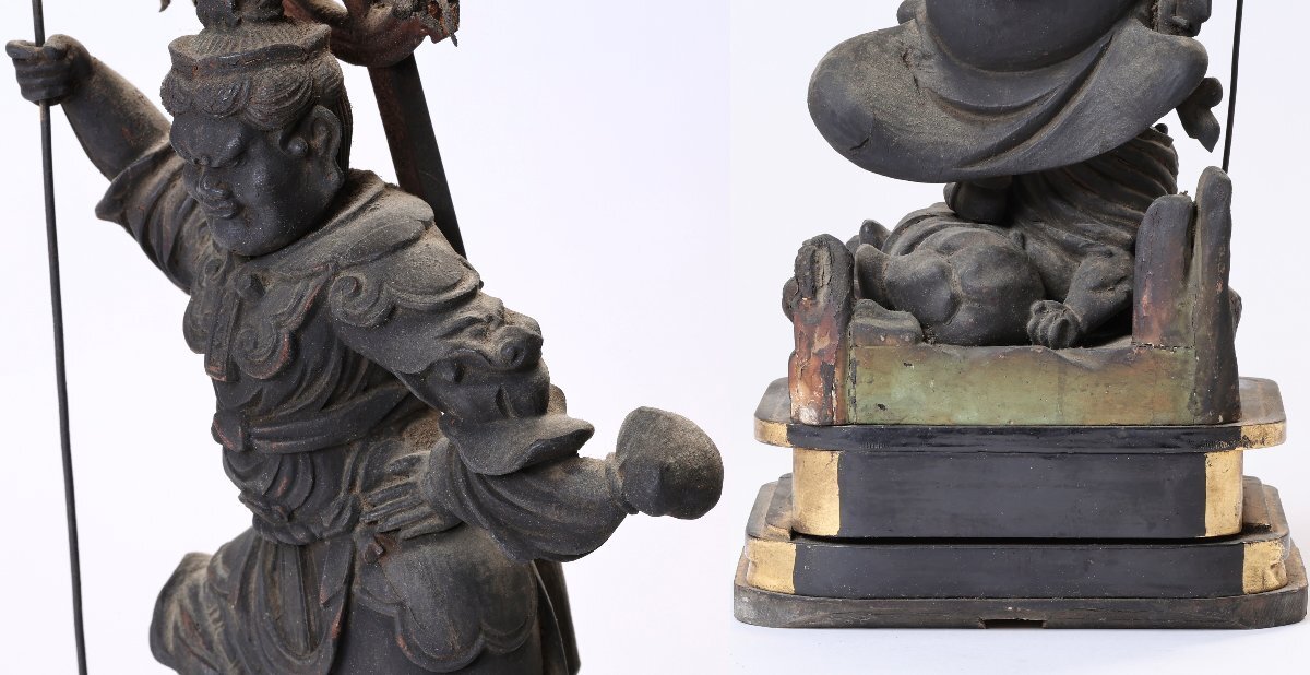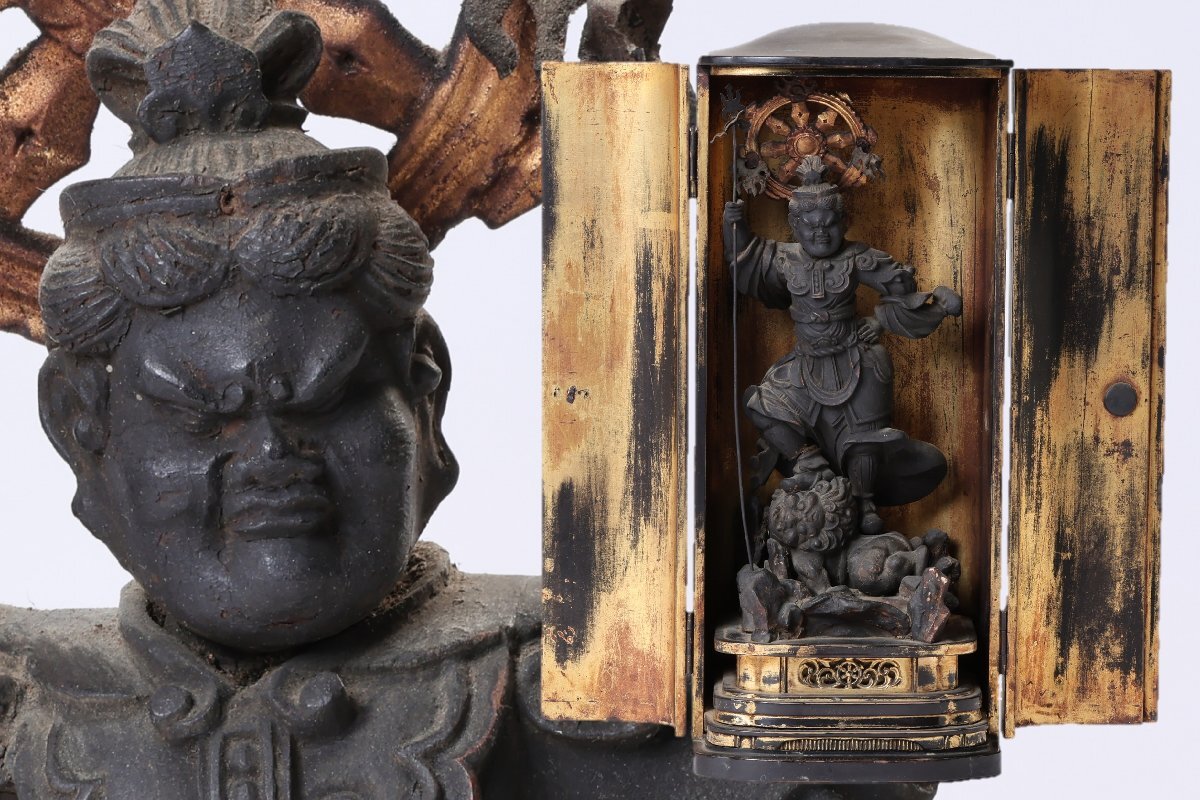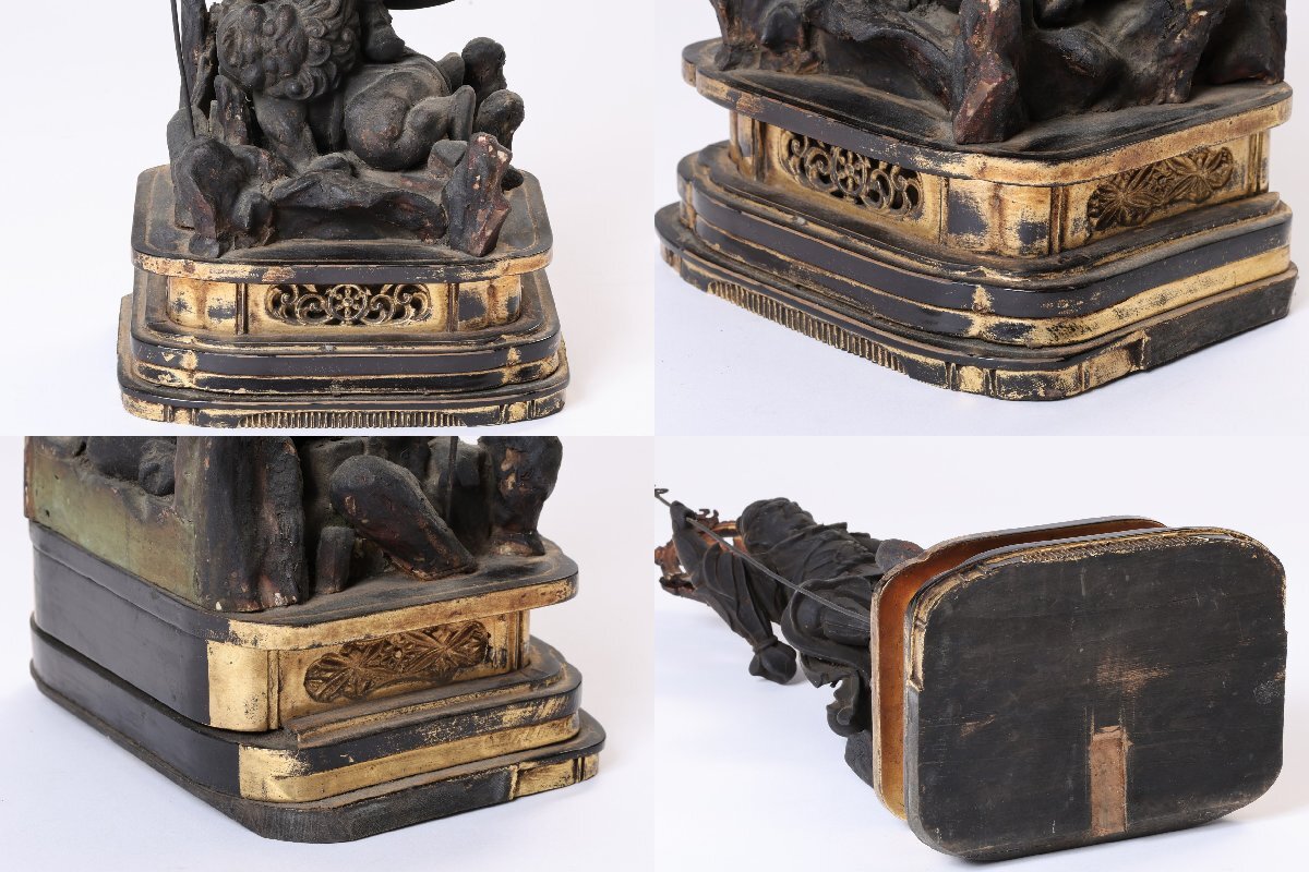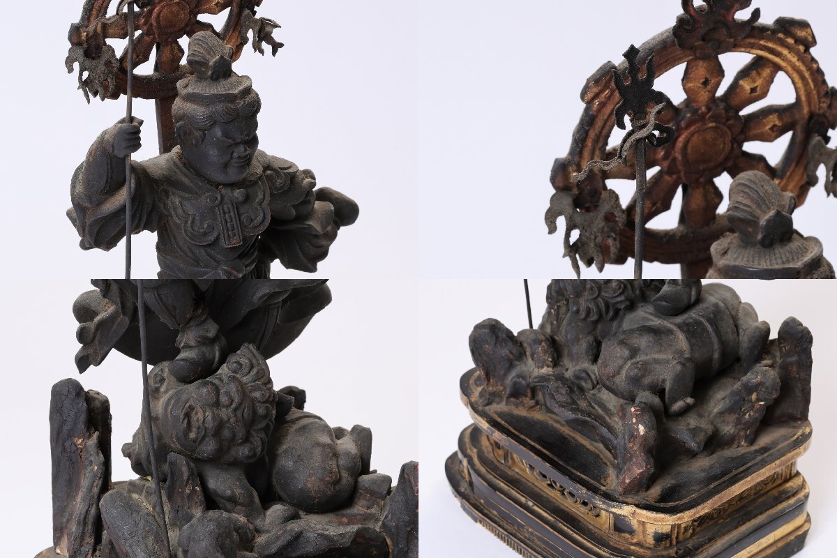 【商品名】 時代 仏像 木彫 増長天立像 厨子 四天王の一尊 密教 仏教美術 オブジェ 【状態】 経年によるキズやヨゴレ、イタミ、ヒビ、割れ、欠け、破損、剥落がございます。 上記を含む商品の状態や詳細(材質等)を写真にてご確認いただき、納得された上での入札をお待ちしております 【大きさ】 仏 高さ:約 40cm 幅:約 16.5cm 奥行き:約 12.5cm 厨子 幅:約 43cm×18cm 高さ:約 15cm (採寸につきましては多少の誤差があるかと思いますので、予めご了承ください。) |