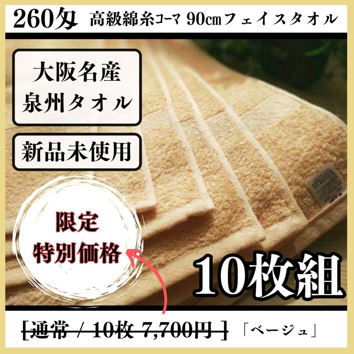 【泉州タオル】260匁高級綿糸コーマコットンベージュフェイスタオルセット10入枚 タオル新品 長さ90cm タオルまとめて 吸水性抜群