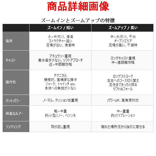 ズームロッドで広がるシーバスゲームの新しい形 ※ S86-96ML 操作性と遠投性のバランスに優れたアイテム。7~12cmクラスのミノーやシンキングペンシル、10~20g台のバイブレーションなどに適応。港湾、河川、干潟、汽水湖などのシーンで活躍。 |