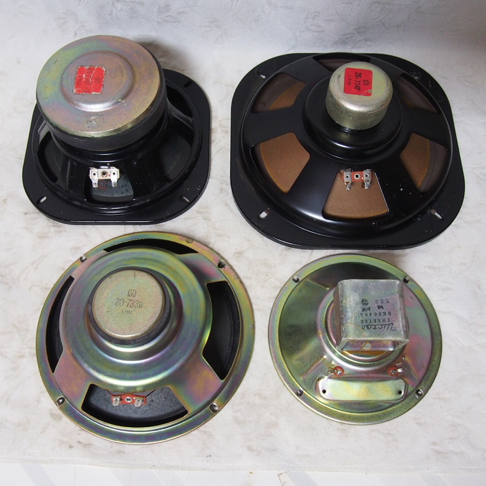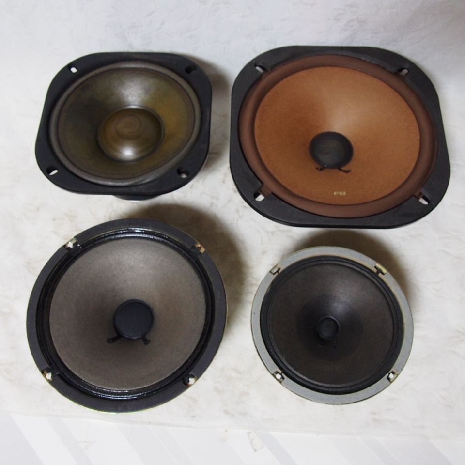● 商品説明 ・・・   当方サイドに於いて長年に渡る「蔵出し品」、テスター点検で 各ボイスコイルの導通を確認済みとし ( チェック済み ) & ノズル式掃除機 細長刷毛 でクリーニング済みとした 完動品、当時 セパレートタイプとしたオールドなオーディオスピーカーから取り外した 状態良好な 「単品4個のセット品」です。程度の方は、年代経過による多少なりの使用感は有りますが、コーン部 & エッジ部の状態も良く チェック & クリーニング済みとしています。内訳は、① Φ20cm PIONEER : 20718F-3 /  ② Φ25cm PIONEER : 25-714F / ③ Φ20cm PIONEER : 20-733B /  ④ Φ16cm VICTOR : SK2048A ( 6Ω 10W ) と成っています。チェック & クリーニング済み 完動品、当時 セパレートタイプとしたオールドなオーディオ機器から取り外した 状態良好な「単品4個のスピーカーセット」は如何でしようか ・・。なお、商品梱包後の大きさは「100 サイズ」と成っています ・・