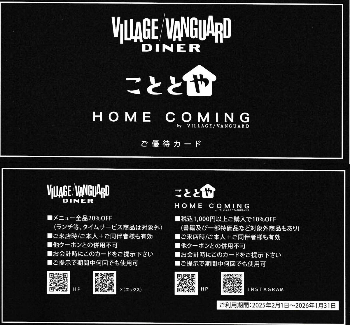 | ●ヴィレッジバンガード株主優待カードです VVダイナー20%OFF こととや/HomeComming税込み1000円以上で10%OFF ● 詳細は写真でご確認ください。 | |