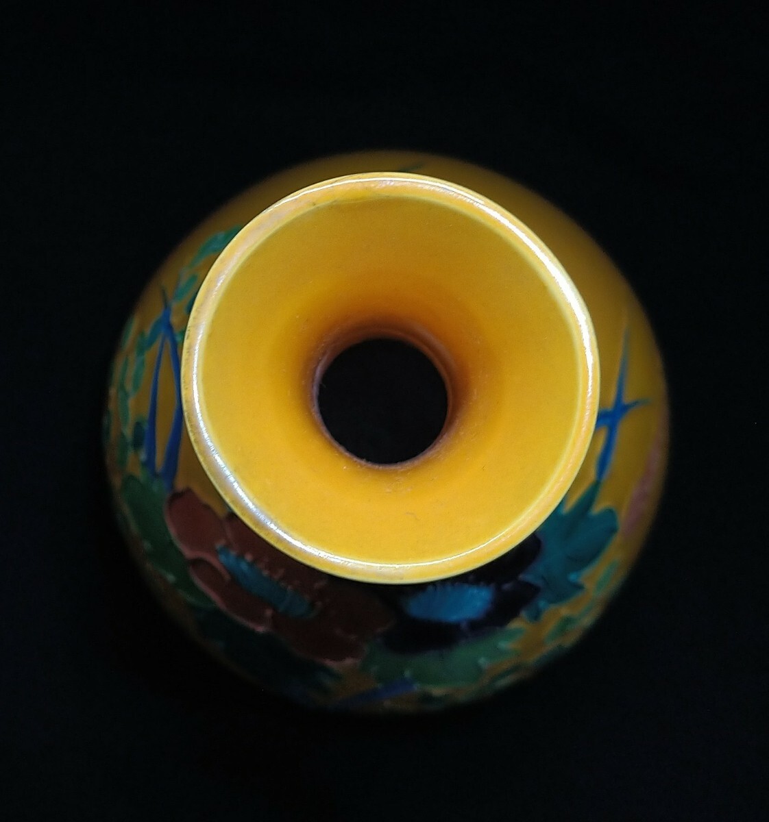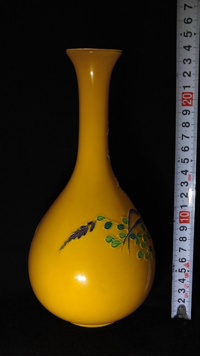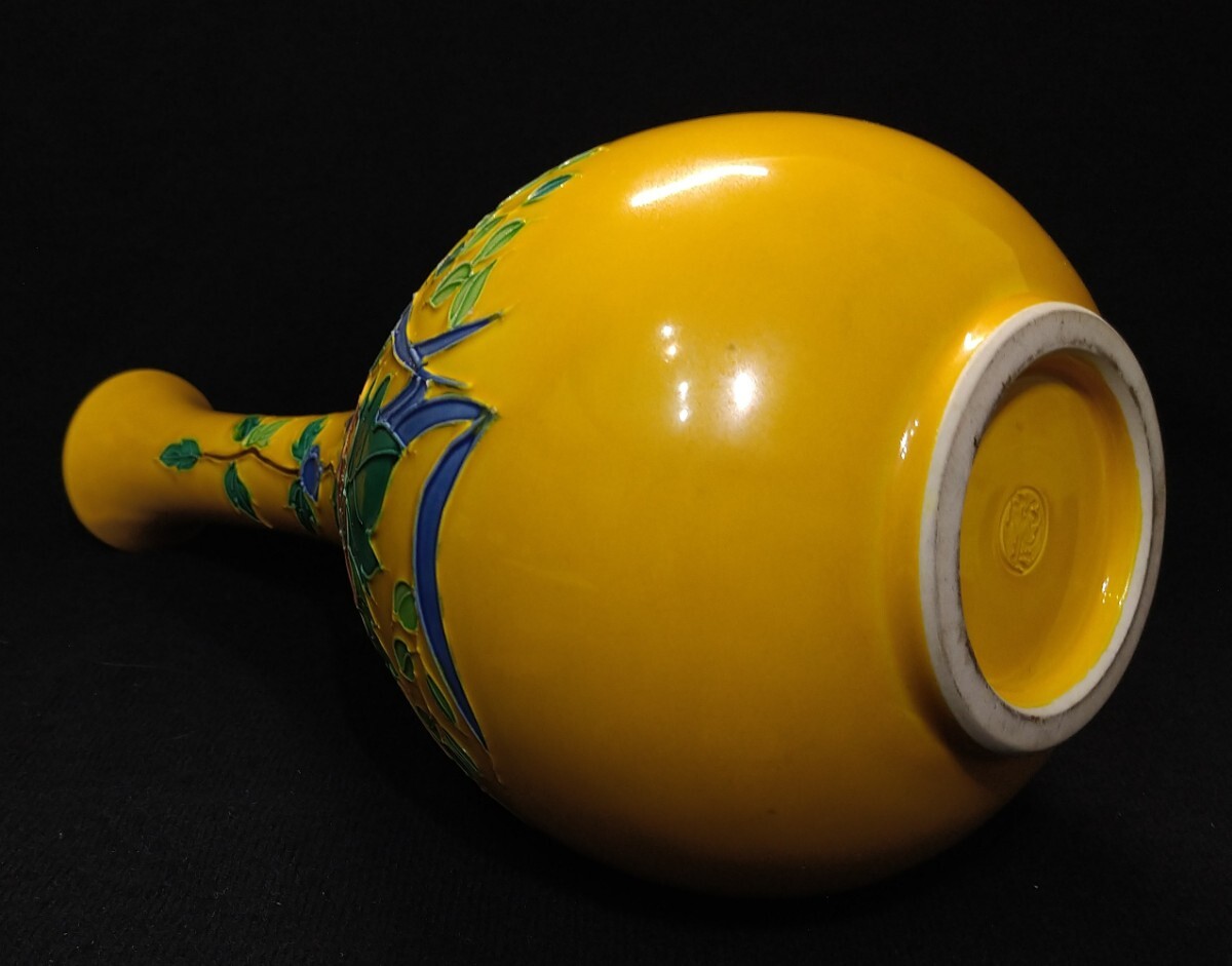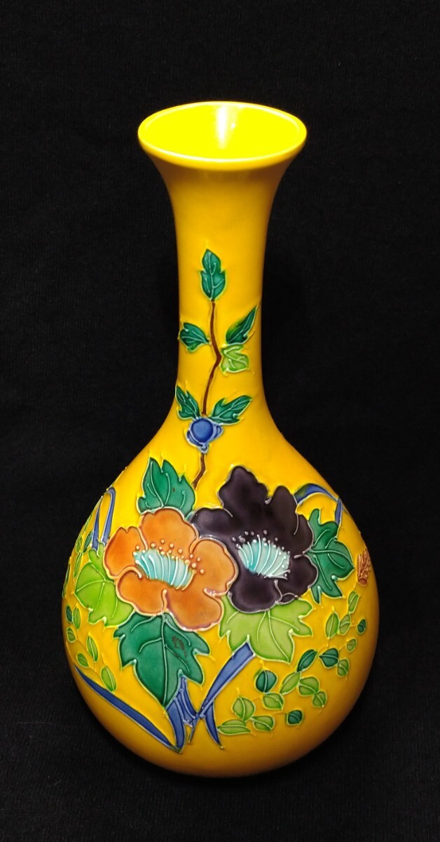 交趾焼の発色の美しさに定評のある、中村翠嵐(1942-)先生の華やかな花器でございます。素人採寸で申し訳ございませんが、径11.9cm、高さ23.9cmでございます。