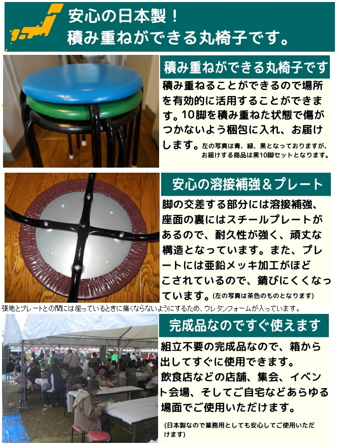 丸椅子 日本製 完成品 業務用 黒 10脚セット 丸イス 丸いす スツール パイプイス 完成品 組立不要 国産