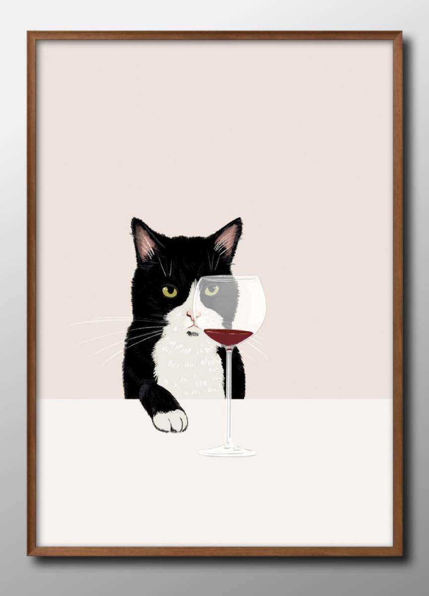 13410■送料無料!!アートポスター 絵画 A3サイズ『猫とワイン ハチワレ』イラスト 北欧 マット紙