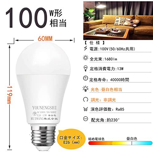 ・昼白色 60mm×110mm ・★商品サイズ(cm):直径約60×高さ約119・★電源:100V(50/60Hz共用) 消費電力:13W・★口金サイズ:E26・★光色:昼白色相当(5000K) 平均演色評価数:Ra85・★全光束:1680lm(ルーメン)