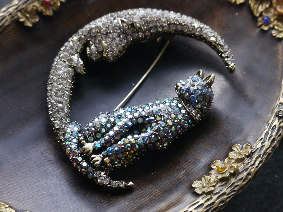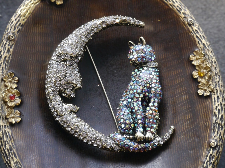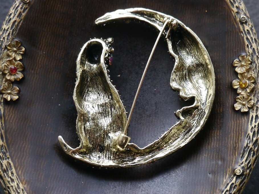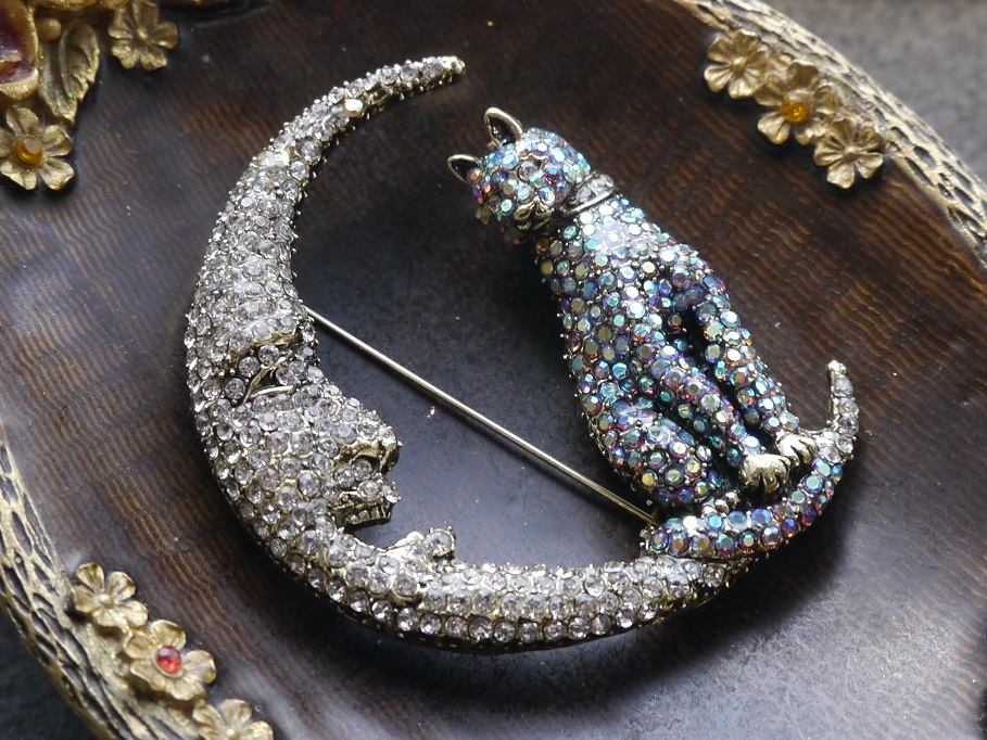 新品アンティーク調キラキラストーン月夜の猫ブローチ クラシック ヴィンテージ風 ヴィクトリアン メルヘン ファンタジー ゴシック