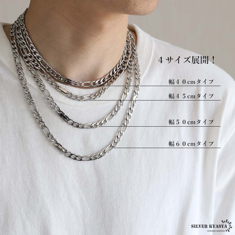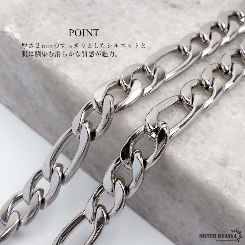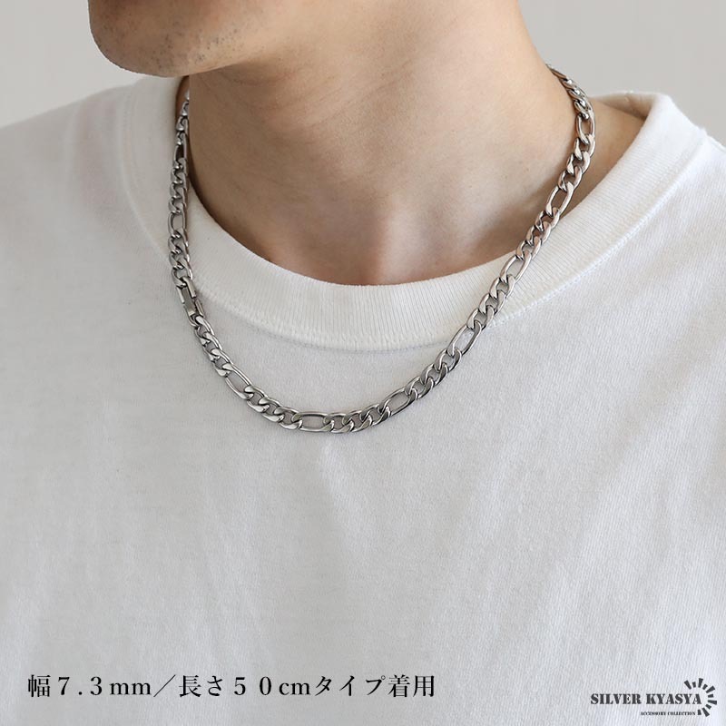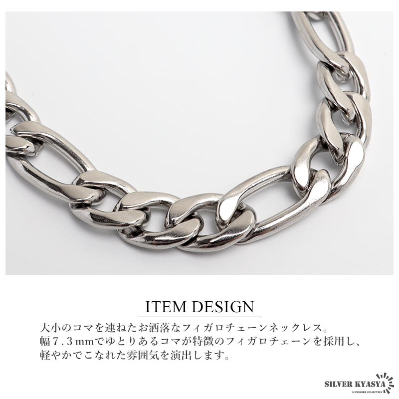 大小のコマを連ねたお洒落なフィガロチェーンネックレス。幅7.3mmでゆとりのあるコマが特徴のフィガロチェーンを採用し、軽やかでこなれた雰囲気を演出します。