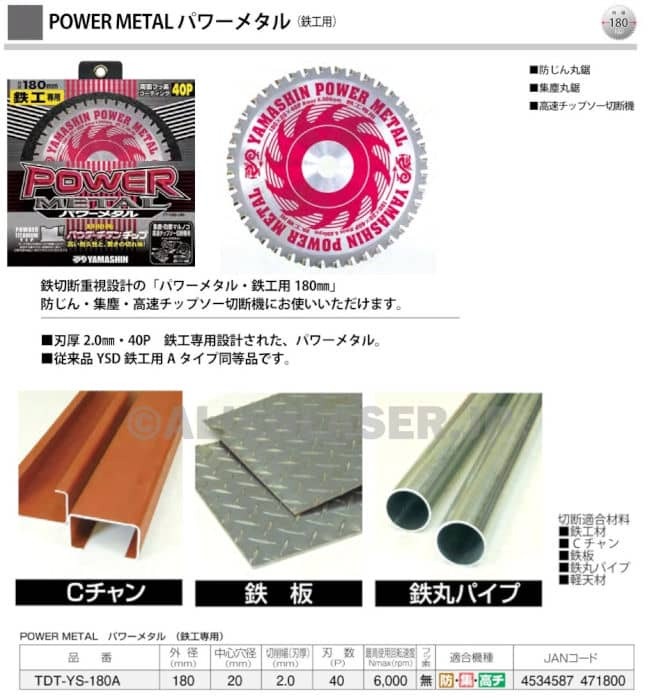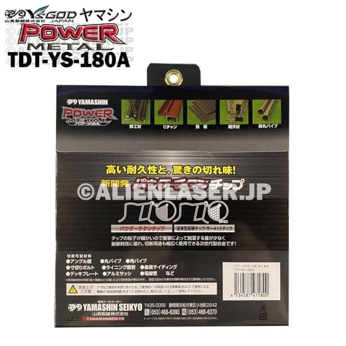 新開発パウダーチタンチップ!高い耐久性と驚きの切れ味!鉄切断重視設計の「パワーメタル・鉄工用」防じん・集塵・高速チップソー切断機にお使い頂けます。TDT-YS-180ATDT-YS-180A外径180mm中心穴径20mm切削幅(刃厚)2.0mm刃数40P最高使用回転速度Nmax6,000rpmフッ素無適合機種防じんマルノコ・集じんマルノコ・高速チップソー専用機※モニターの発色具合により、実際のものと色が異なる場合がございます。