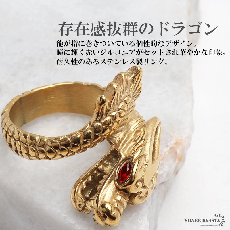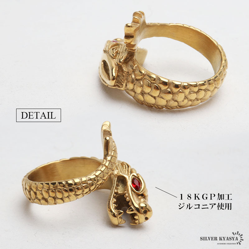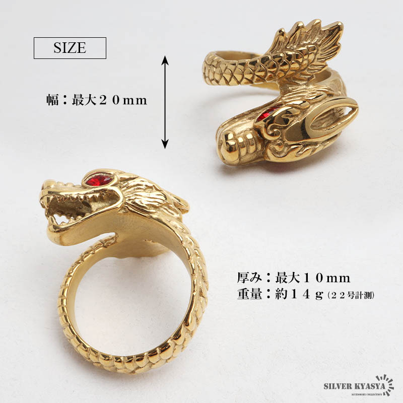 | 商品概要 | ■存在感抜群のドラゴン 龍が指に巻き付いている個性的なデザイン。瞳に輝く赤いジルコニアがセットされ華やかな印象。 ■ステンレス素材を使用 金属部分は頑丈なことで知られるステンレス素材を採用。耐久性はもちろん耐水性も高く水場での着用も可能。金属アレルギーも出にくいとされている金属です。 |
