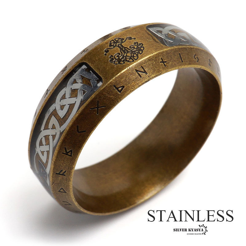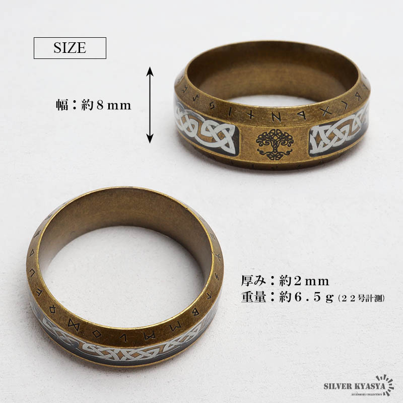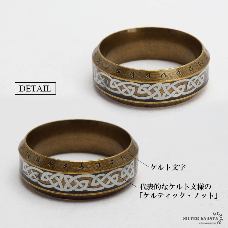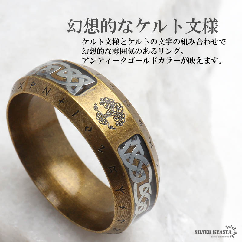 | 商品概要 | ■幻想的なケルト文様 ケルト文様とケルト文字の組み合わせで幻想的な雰囲気のあるリング。アンティークゴールドカラーが映えます。 ■ステンレス素材を使用 金属部分は頑丈なことで知られるステンレス素材を採用。耐久性はもちろん耐水性も高く水場での着用も可能。金属アレルギーも出にくいとされている金属です。 |