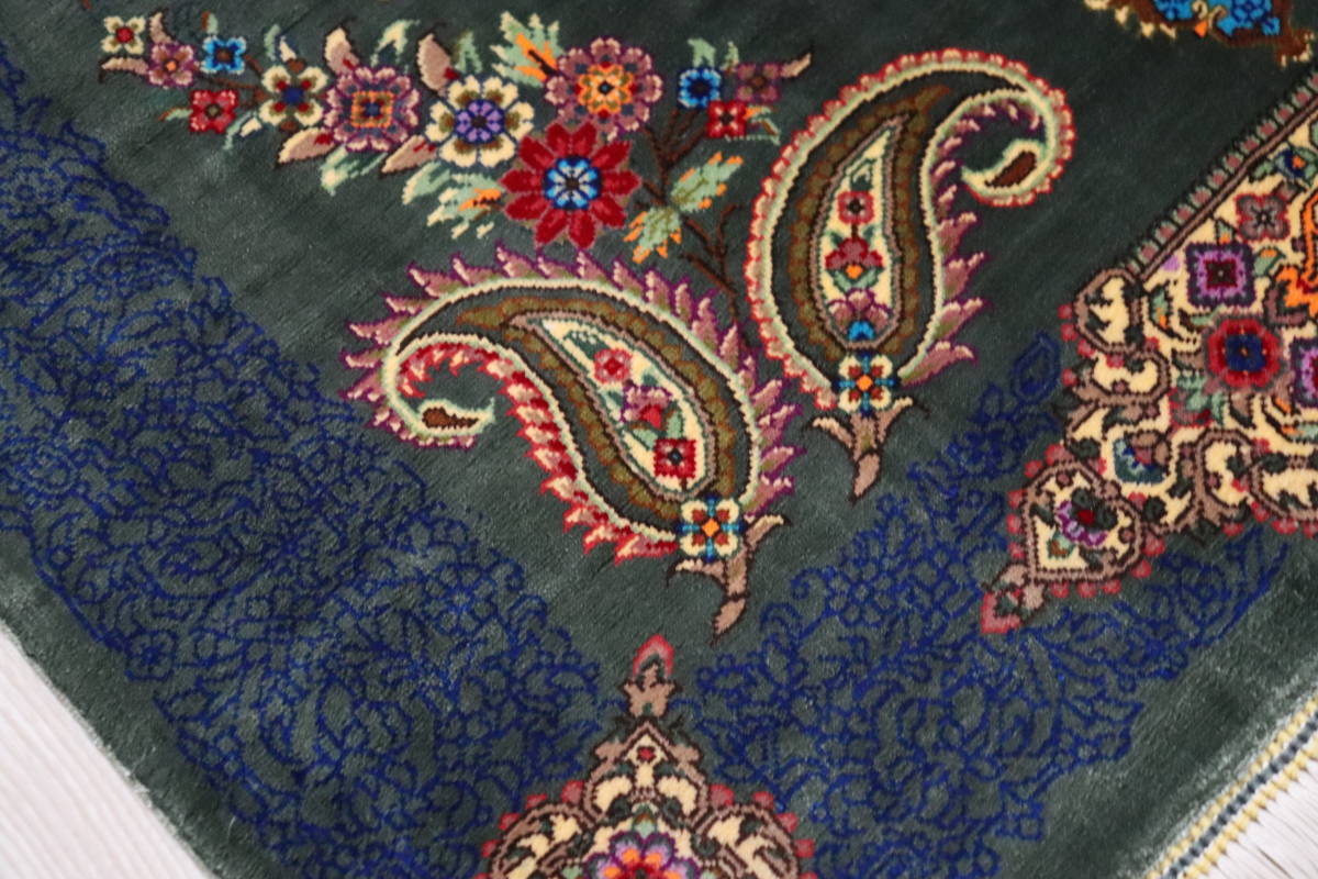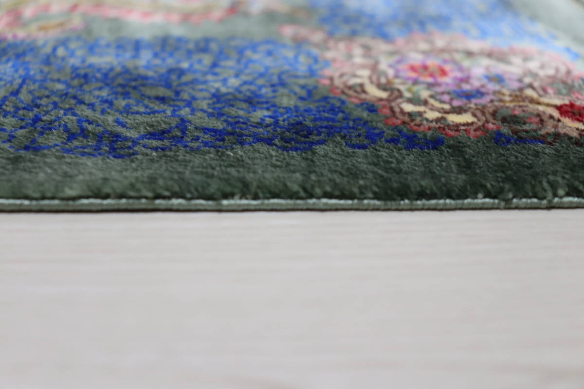 素材はシルク100%ですので、薄く、手触りは柔らかく、そのしなやかで繊細な品質は、他を圧倒するほどの出来映えです。驚くような細かな織り目とビロードのような生地、肌に吸い付くようなシルクの艶やかな光沢感が豪華絢爛。まさに、「The ペルシャ絨毯」と言うべき最高峰のペルシャ絨毯は、もはや工芸品ではなく美術品としての価値となります。