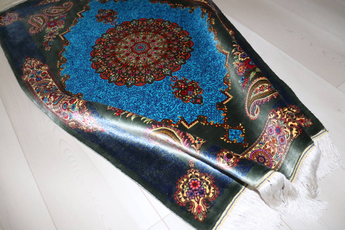 この絨毯は、緻密な手織り技術で製作されており、120万ノット平方メートルという高い密度が、耐久性と柔らかさの両方を兼ね備えています。リビングルームや玄関、壁掛けとして使用することで、空間に高級感を加えるとともに、インテリアのアクセントとしても最適です。