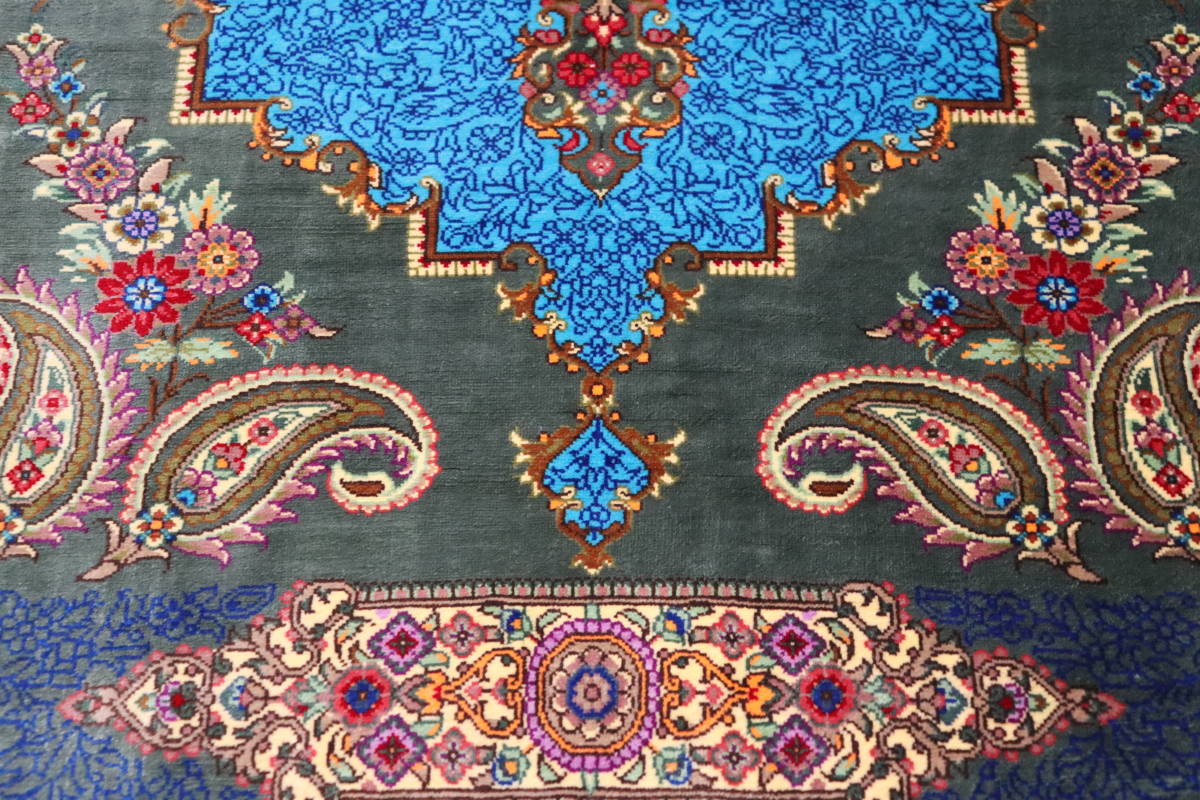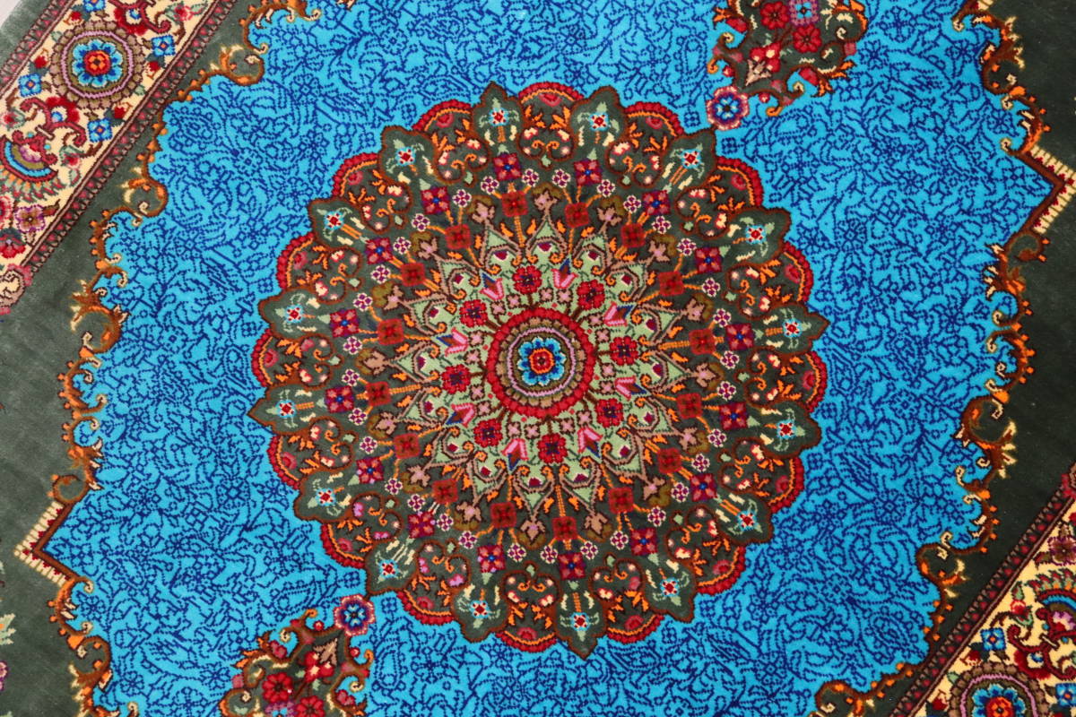 本作品は、深いグリーンのフィールドカラーと鮮やかなスカイブルーのメダリオンが特徴のペルシャ絨毯です。アルバル工房の匠の技が光るこの一品は、視覚的にも高級感あふれるデザインを誇ります。スカイブルーの中央メダリオンは細かな花模様が織り込まれており、その周囲を囲むグリーンのフィールドが鮮やかな色合いを引き立てています。