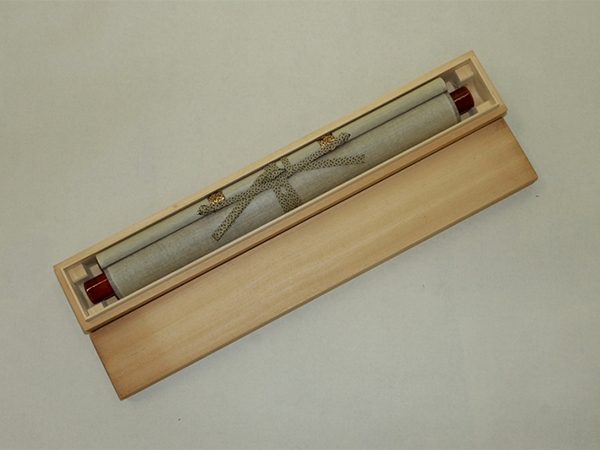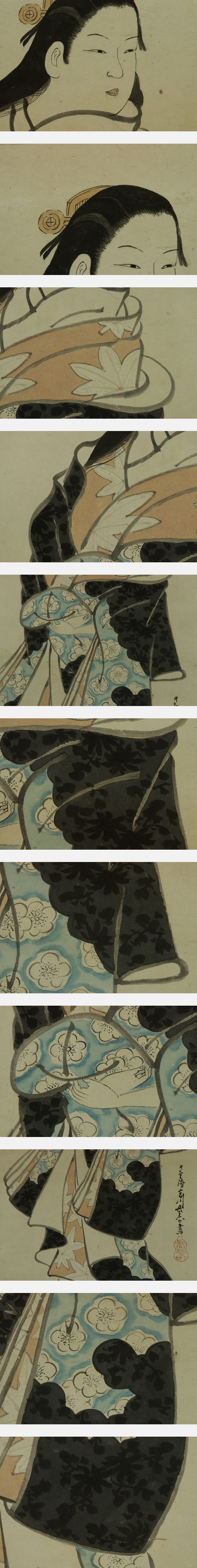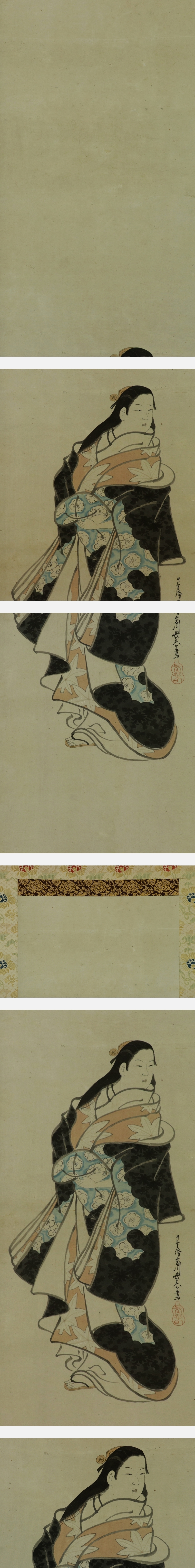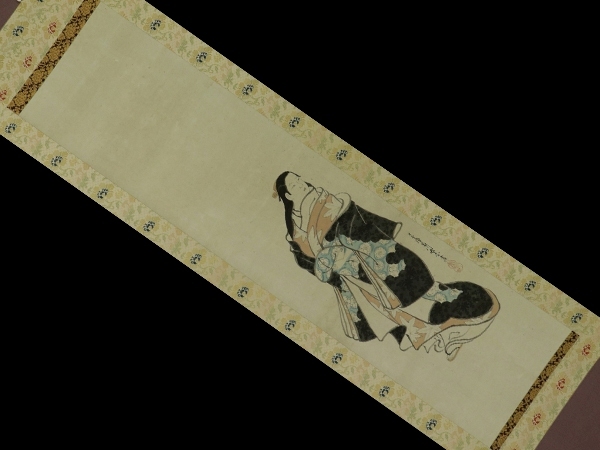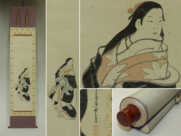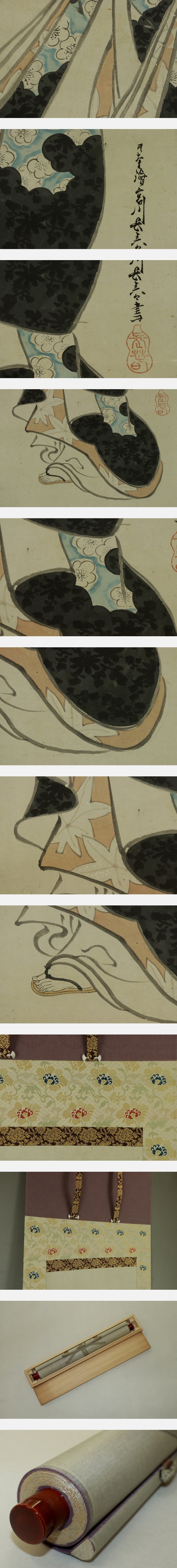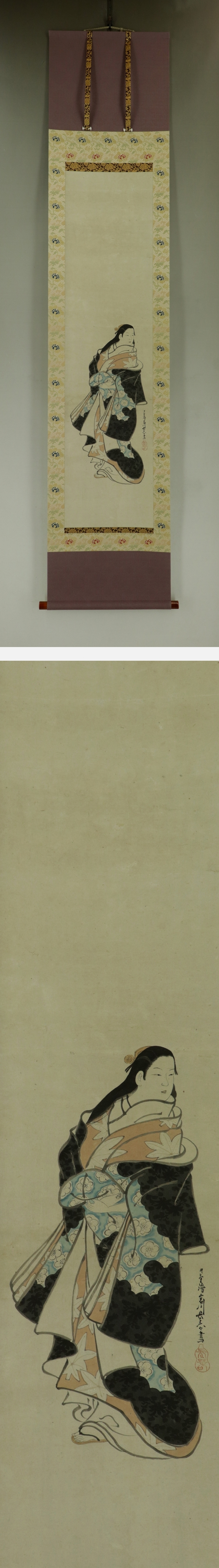宮川長春 みやがわ-ちょうしゅん(1682-1752) 江戸時代中期の浮世絵師。天和2年生まれ。宮川派の祖。肉筆の美人画で名高い。 寛延2年日光廟修理で狩野春賀に雇われ, 画料の未払いから翌年一門による春賀ら殺傷事件が起こった。 宝暦2年11月13日死去。71歳。 尾張(愛知県)出身。 本紙は、染み痕、虫食い痕、破れ痕があります。 表装は、良好です。 【サイズ】 作品 横約29.5cm×縦約121cm 表装 横約41cm×縦約196cm |