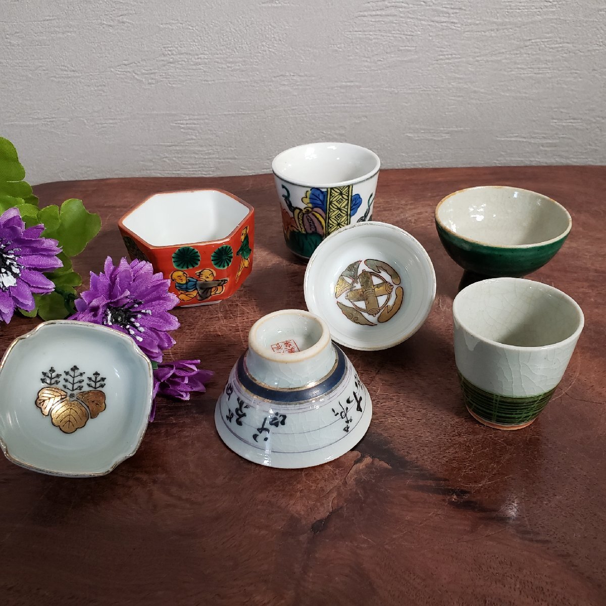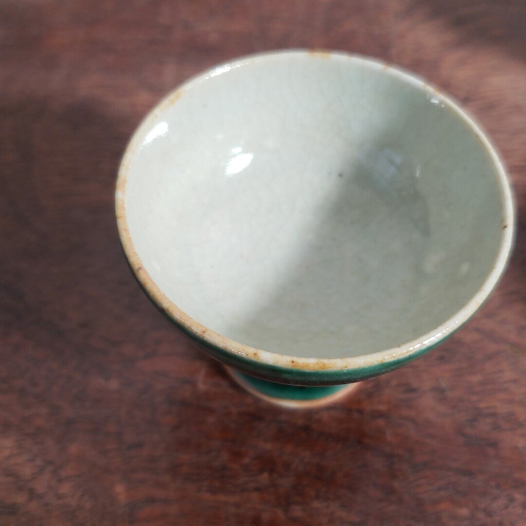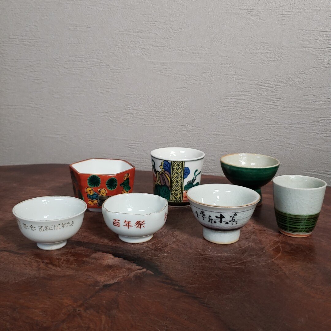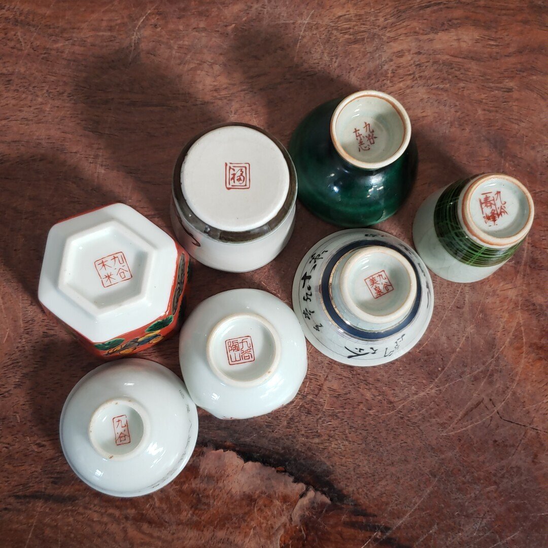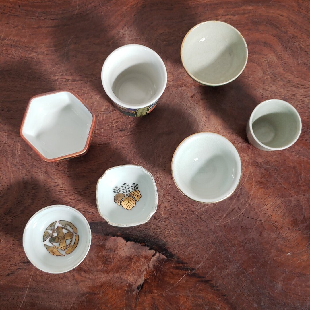レトロな九谷焼のお猪口を集めました。汚れや絵柄の剥げが多いものがあります。経年による汚れ、擦れ、貫入があります。