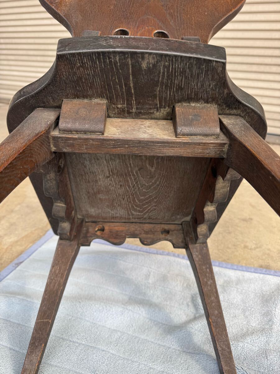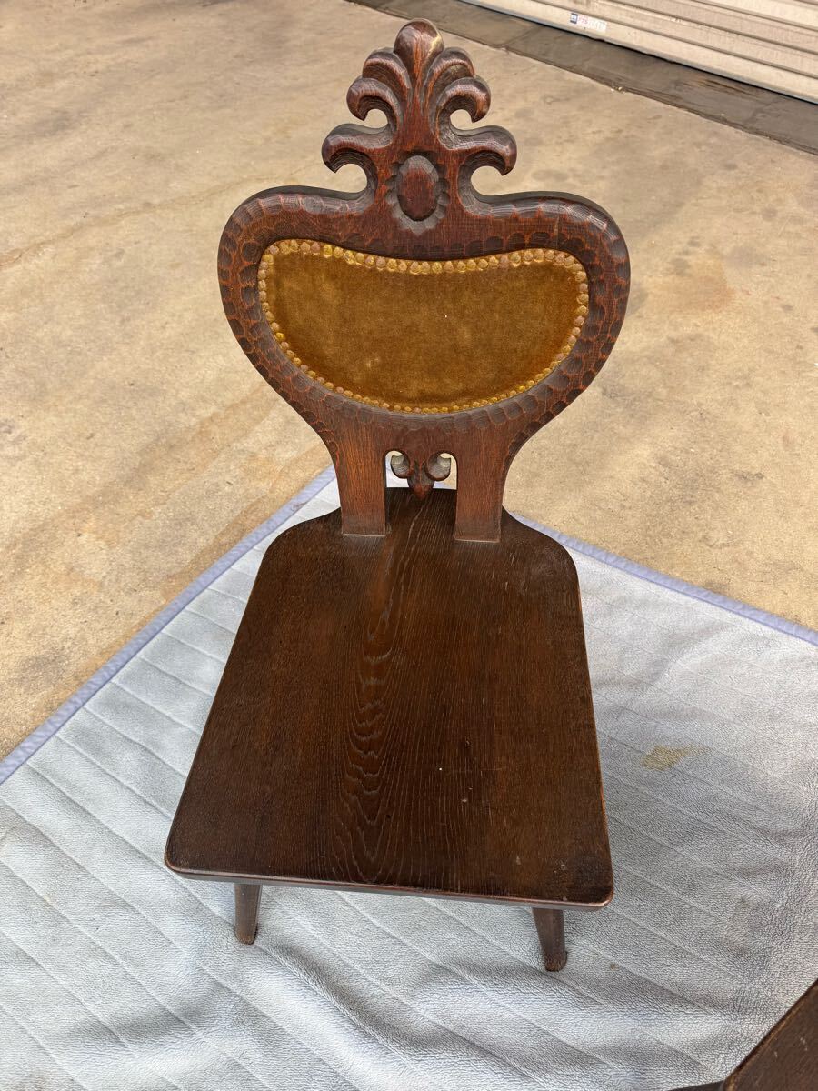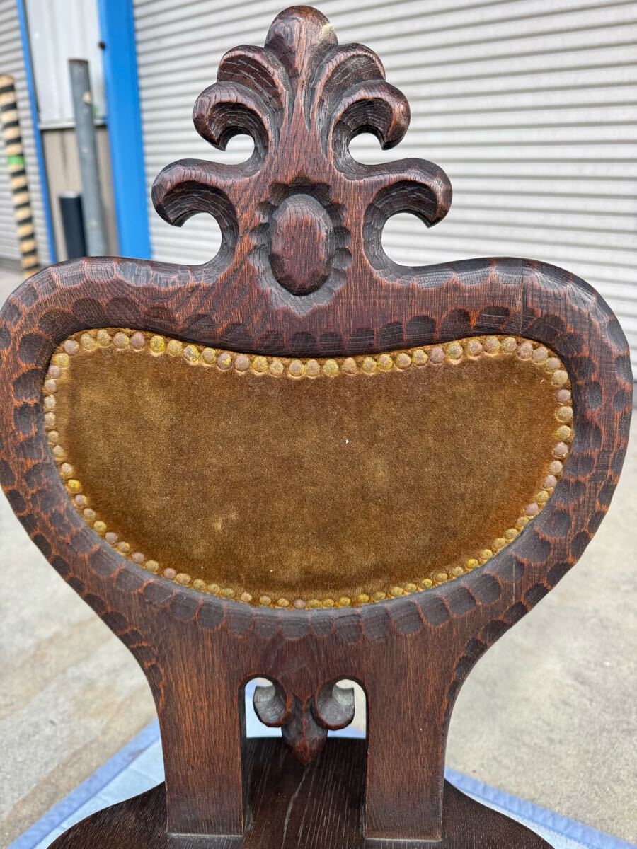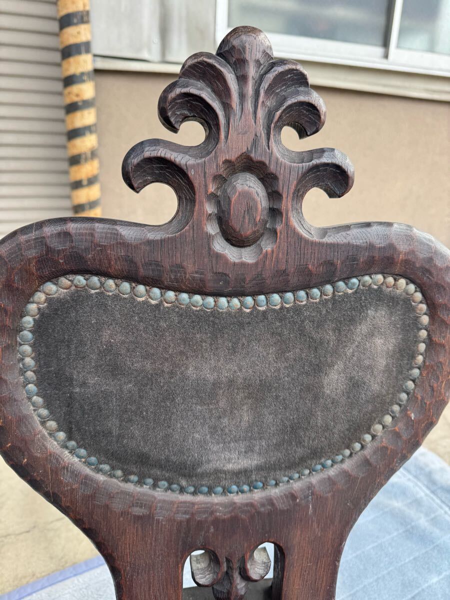 彫刻が素敵なデザインで、背もたれに施された鋲打ちがまたアンティークな雰囲気たっぷりです。少し低めの座面が可愛いらしいサイズ感で素敵です。