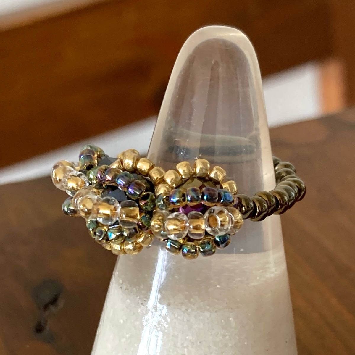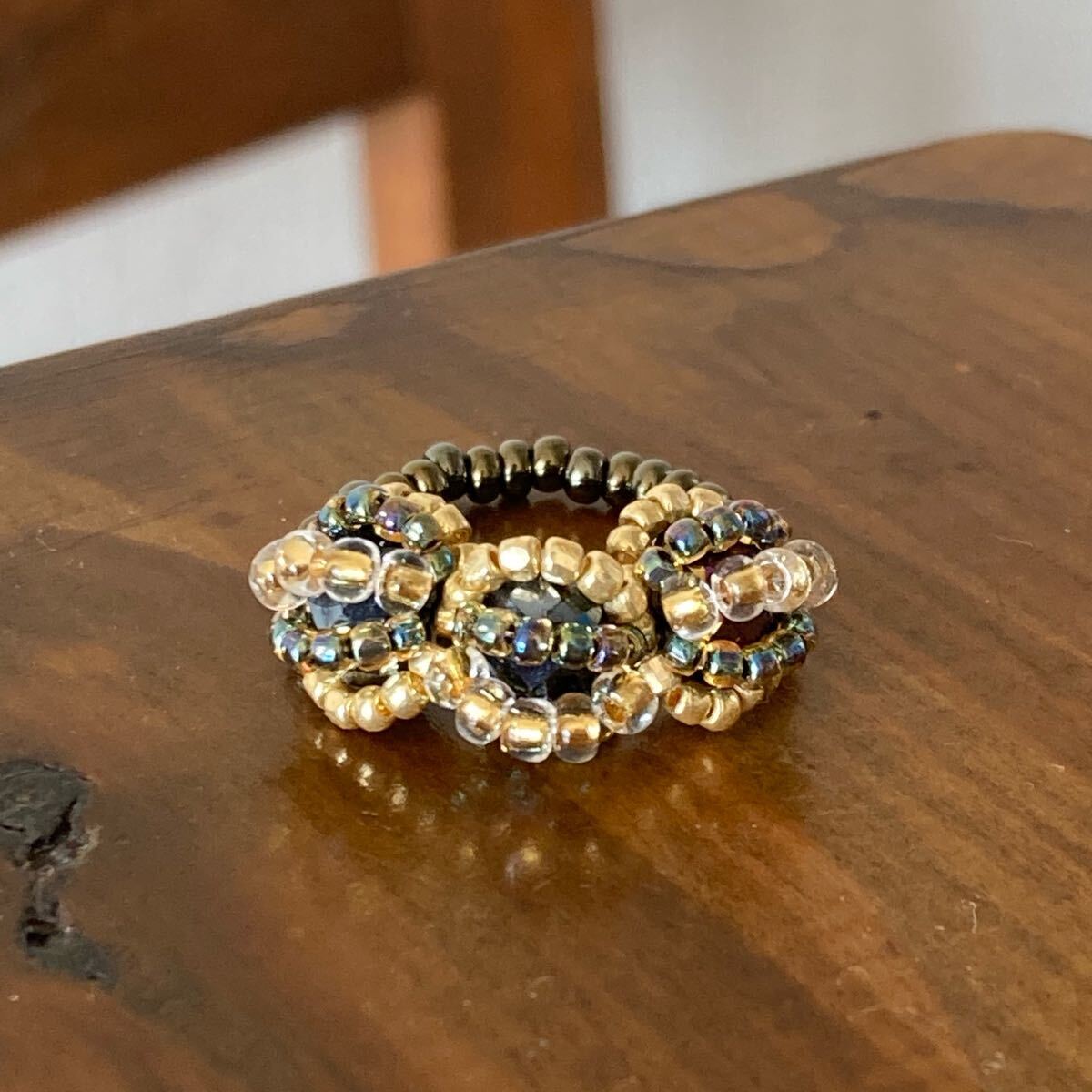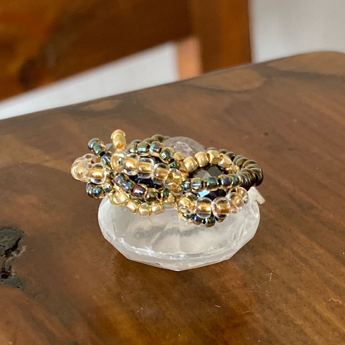 8mmのメタリックグレーのボタンカットビーズ、クリアで中心がゴールドの丸大ビーズ、グリーン系ブロンズの丸大ビーズ、ゴールドのスリーカットビーズ、グーリーンオーロラのスリーカットビーズで作ったリングです。