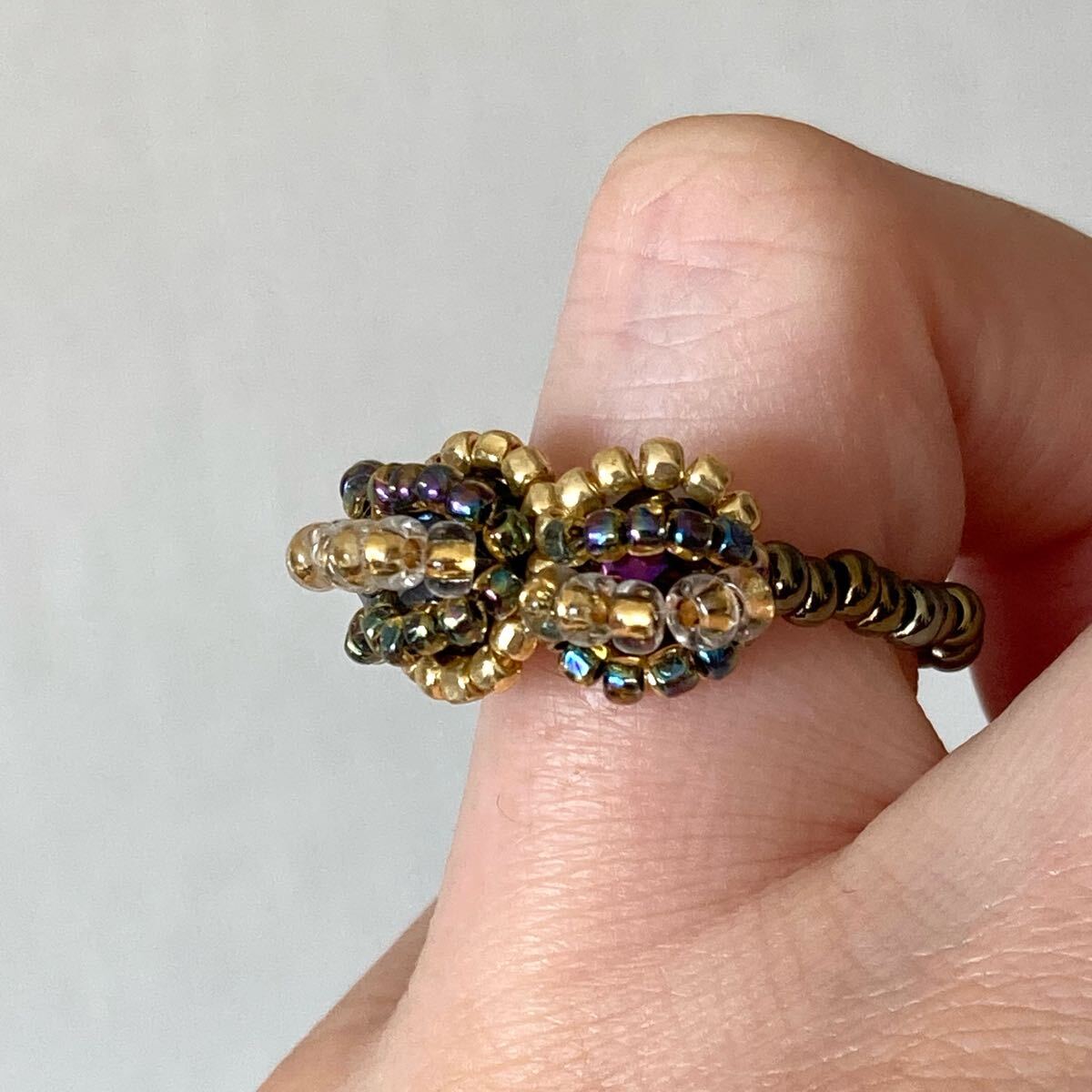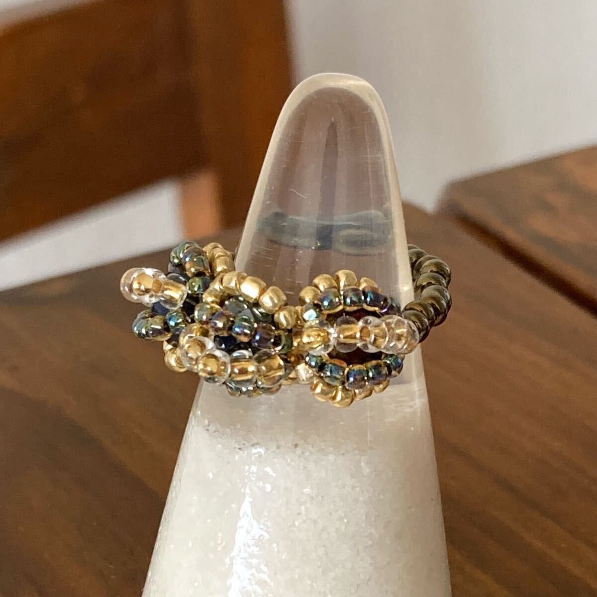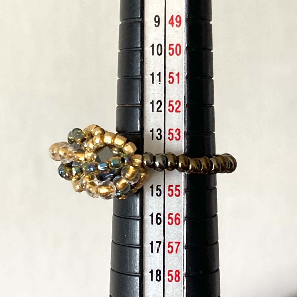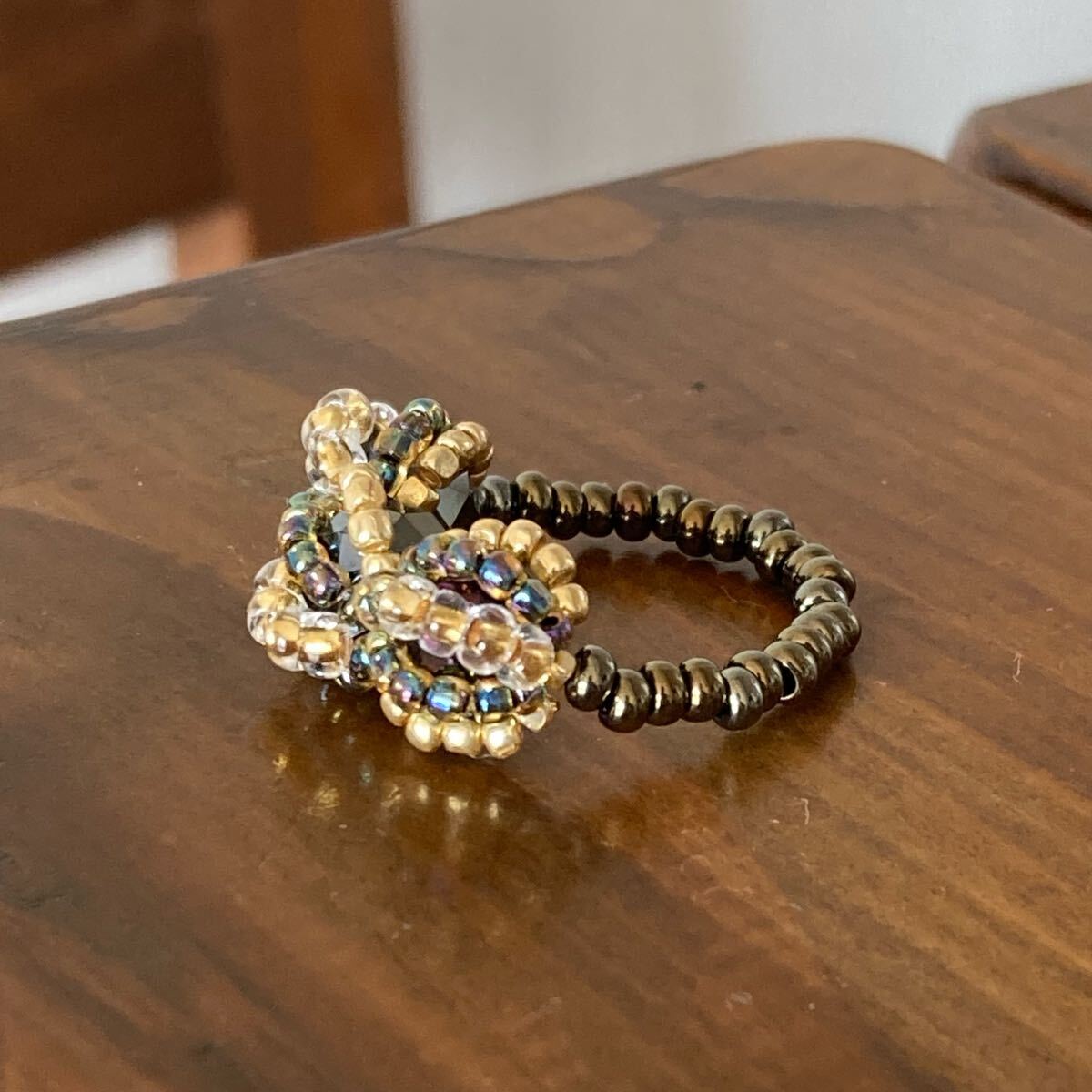 8mmのメタリックグレーのボタンカットビーズ、クリアで中心がゴールドの丸大ビーズ、グリーン系ブロンズの丸大ビーズ、ゴールドのスリーカットビーズ、グーリーンオーロラのスリーカットビーズで作ったリングです。