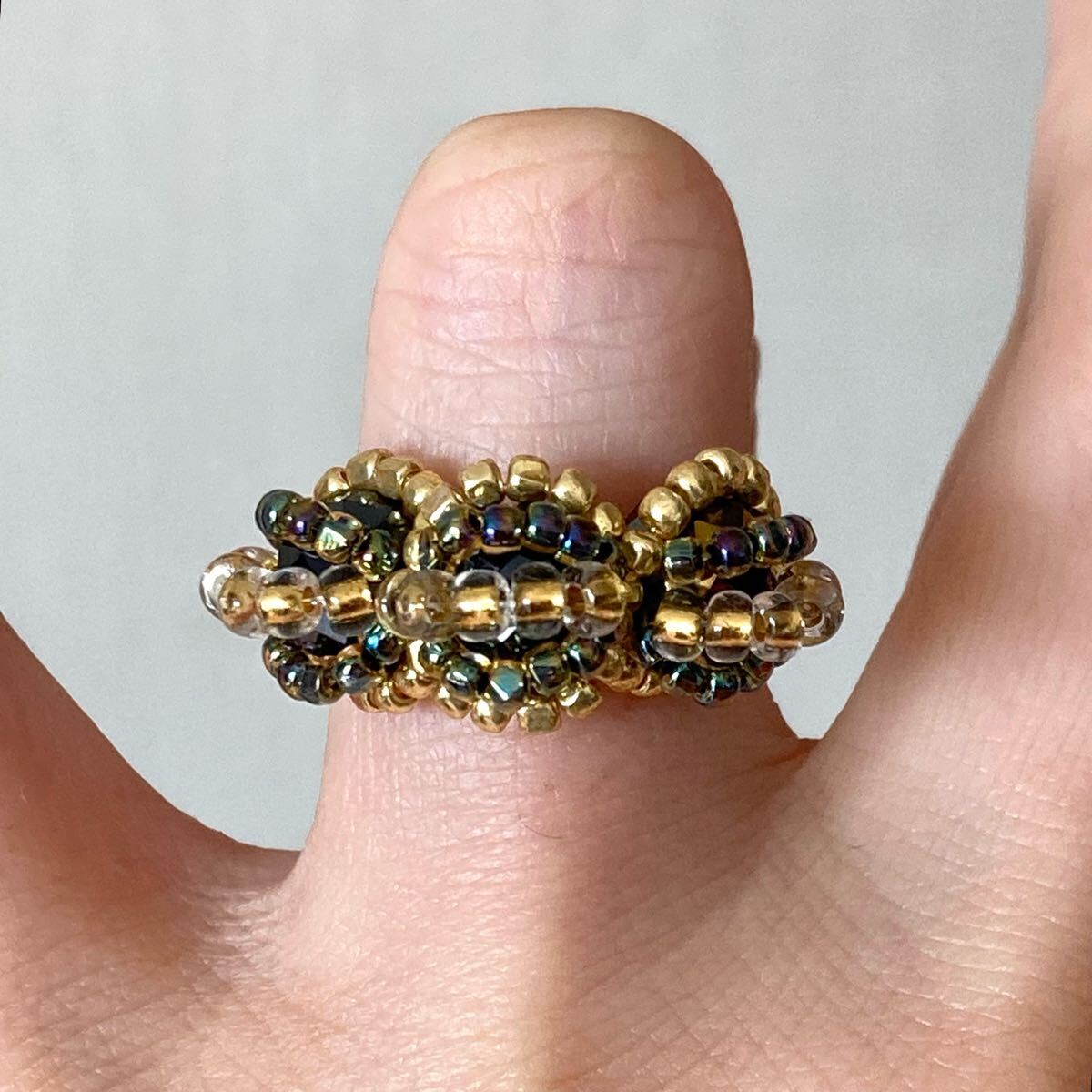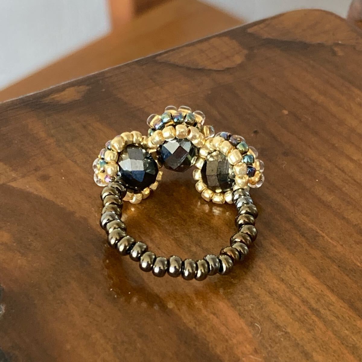 ボタンカットビーズの周りにビーズを5重に巻き付けて作ったビーズボールを3個並べたゴージャス感のあるボリュームリングです♪