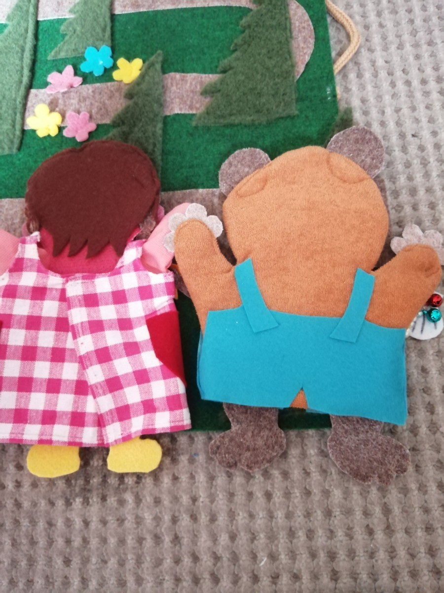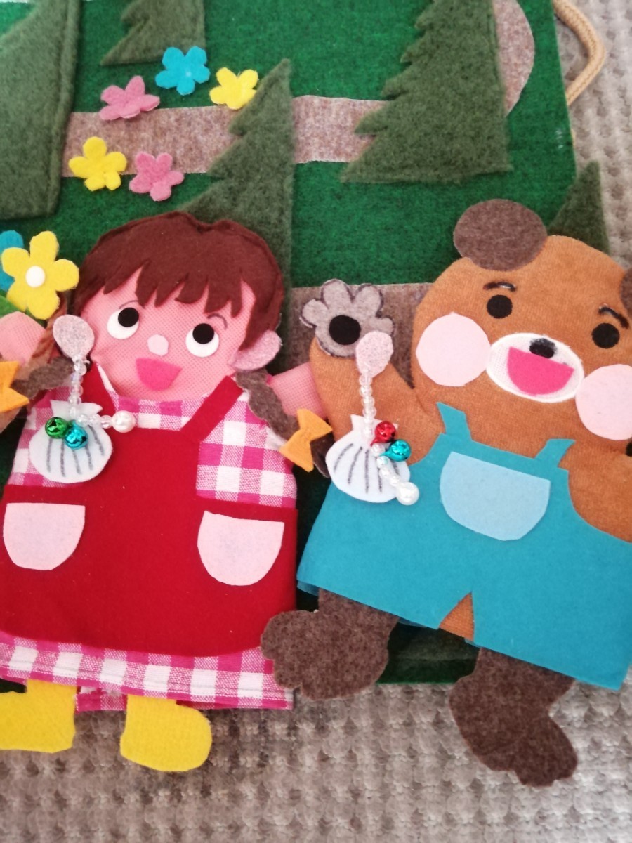 熊はウォッシングミトンをリメイクしました。熊と女の子は大きめに出来ているので男性の手にも入ります。 すぐ歌に入ってしまうのではなく、女の子が自己紹介したり、「私ね、おばあちゃんの家までお使いに行くの…」など自由に観客に話掛けて下さい。