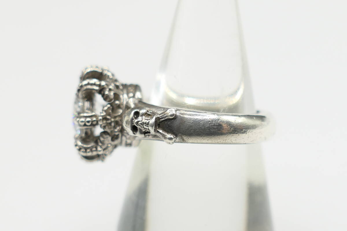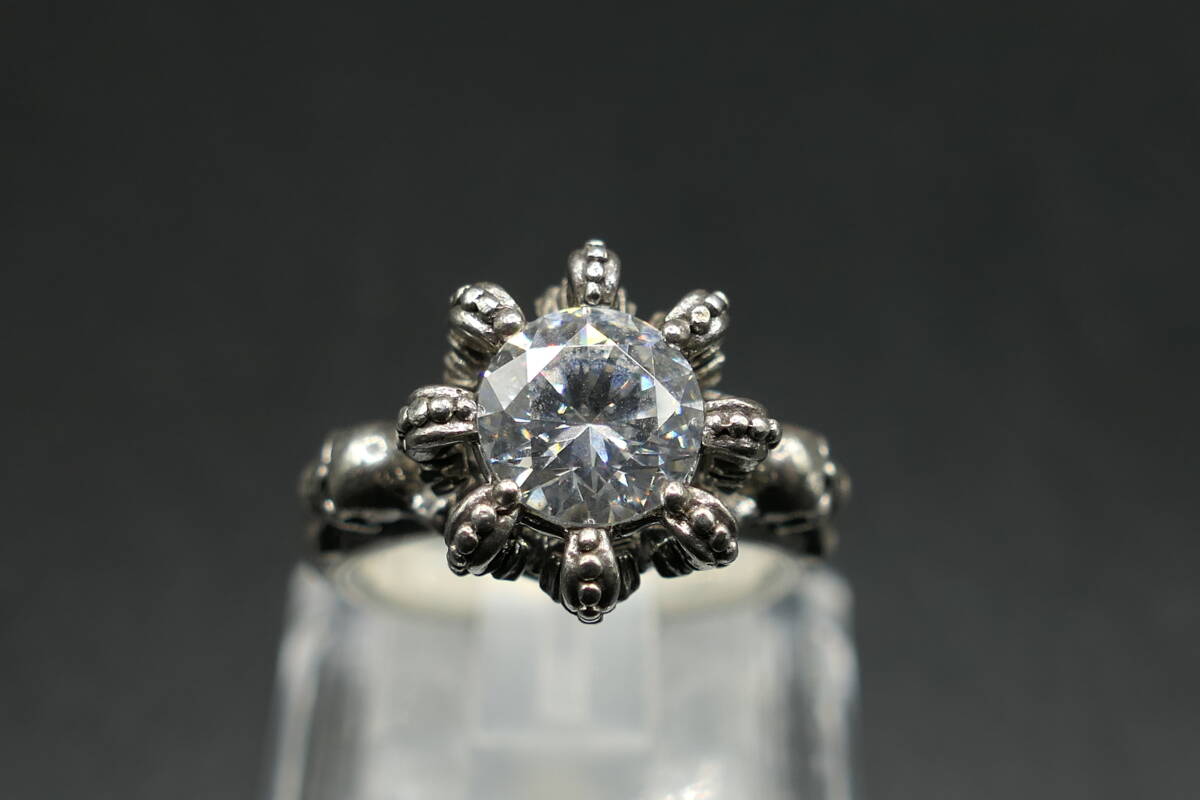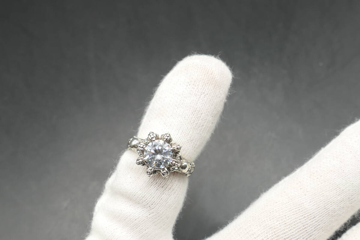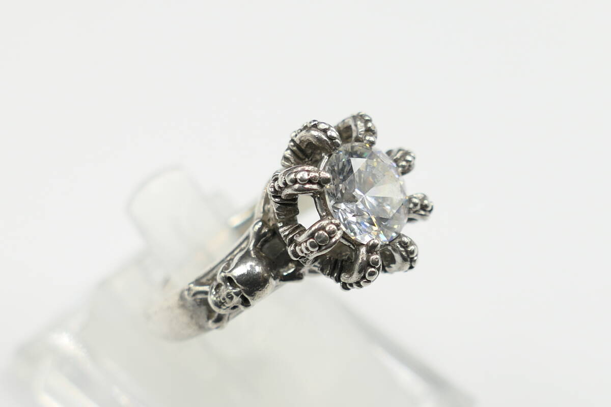 大粒で光を反射してキラキラ輝く豪華なジルコニアをクラウンで包み、サイドにはスカルをあしらったジャスティンデイビスらしいデザインです。