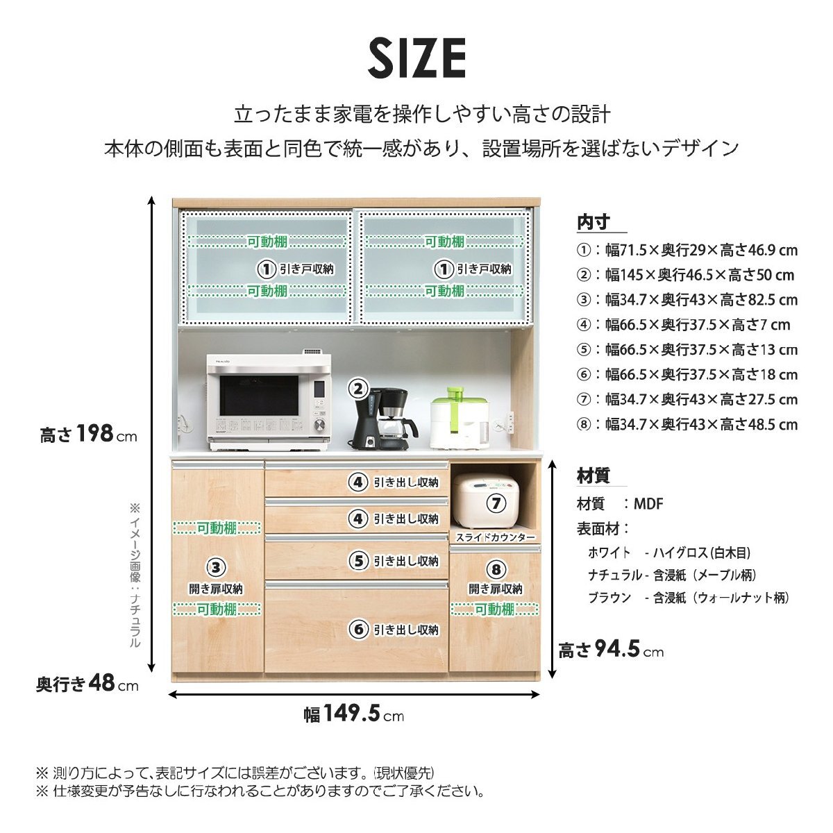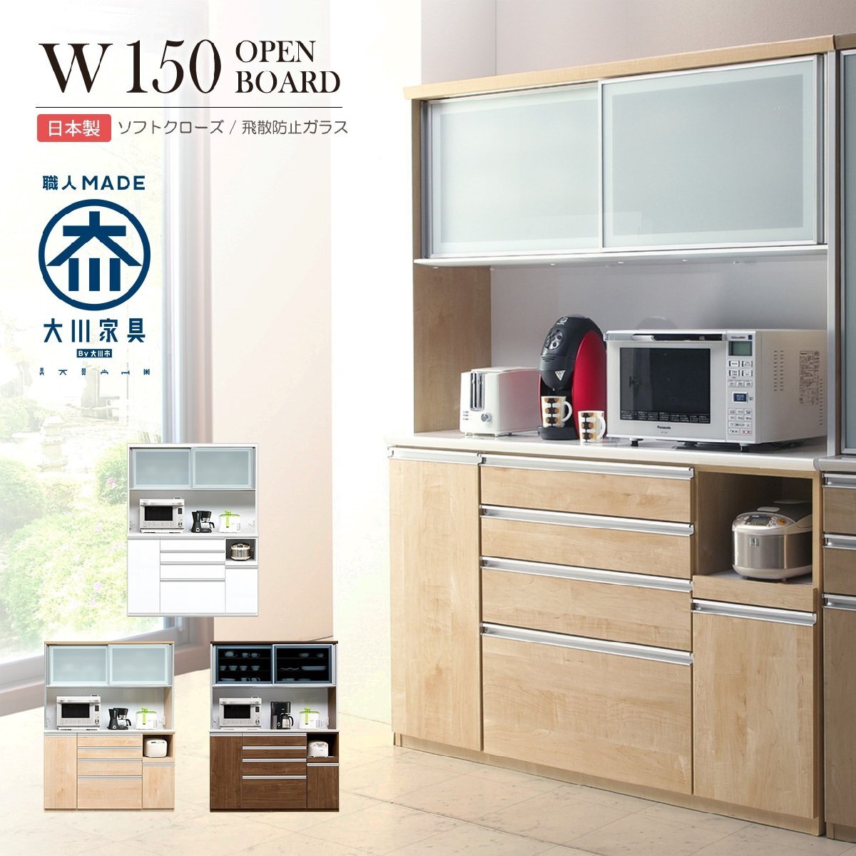 キッチンボード 食器棚 レンジ台 収納 幅150cm 完成品 引き出し ソフトクローズ キッチン収納 モダン ブラウン