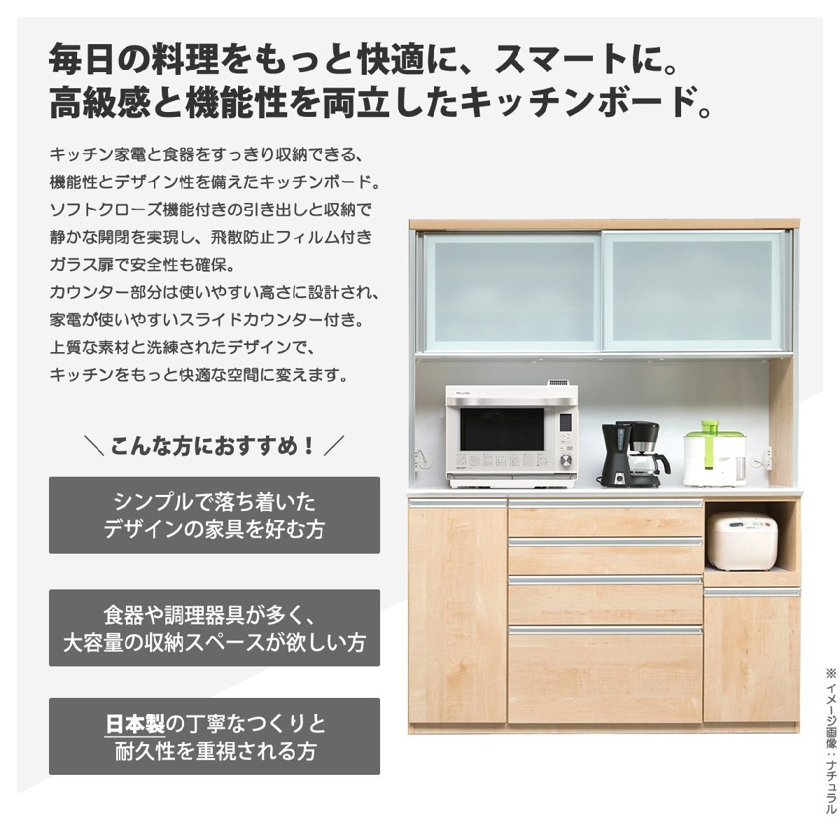 特  徴キッチン家電と食器をすっきり収納できる、機能性とデザイン性を兼ね備えたキッチンボード。