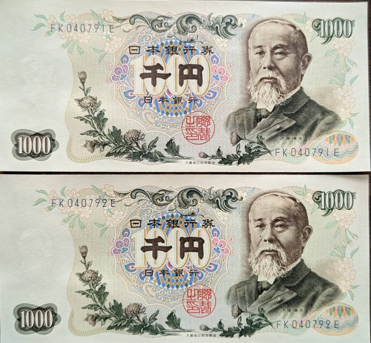 [即決/未使用/おまとめ] 伊藤博文 1000円×2枚 FK040791E/FK040792E 旧千円札(大きな折り目無し・連番多数あり) 日本銀行券 旧紙幣 同梱可