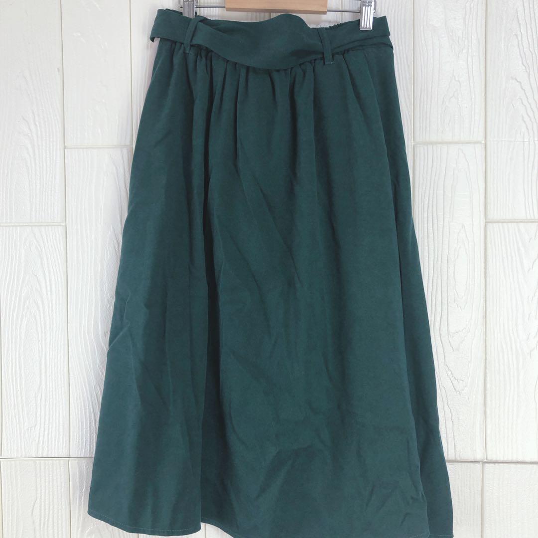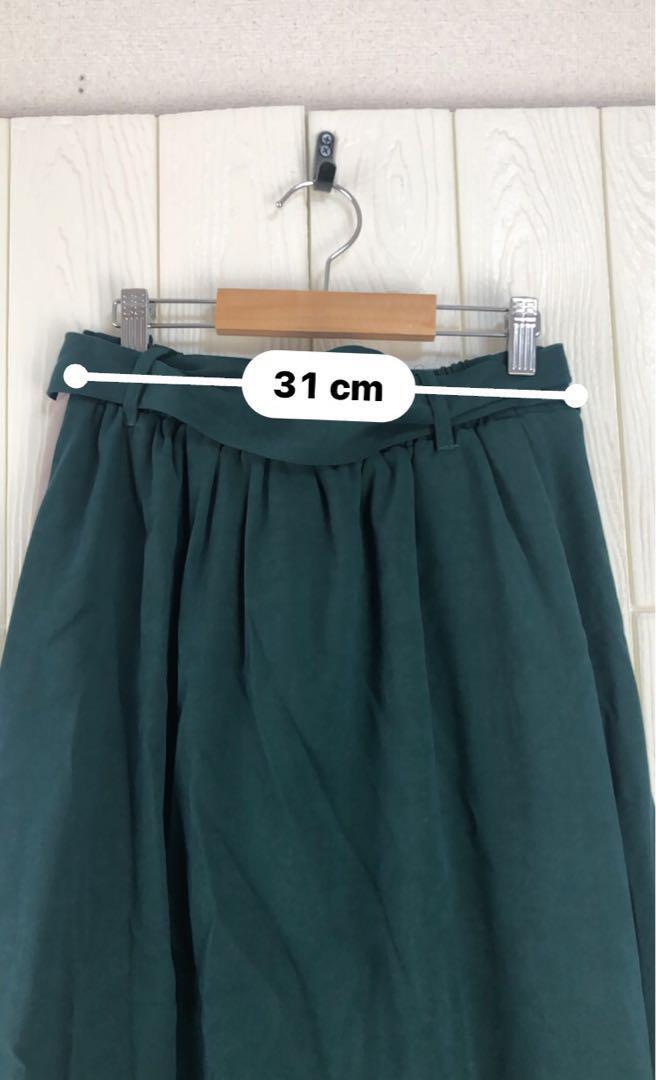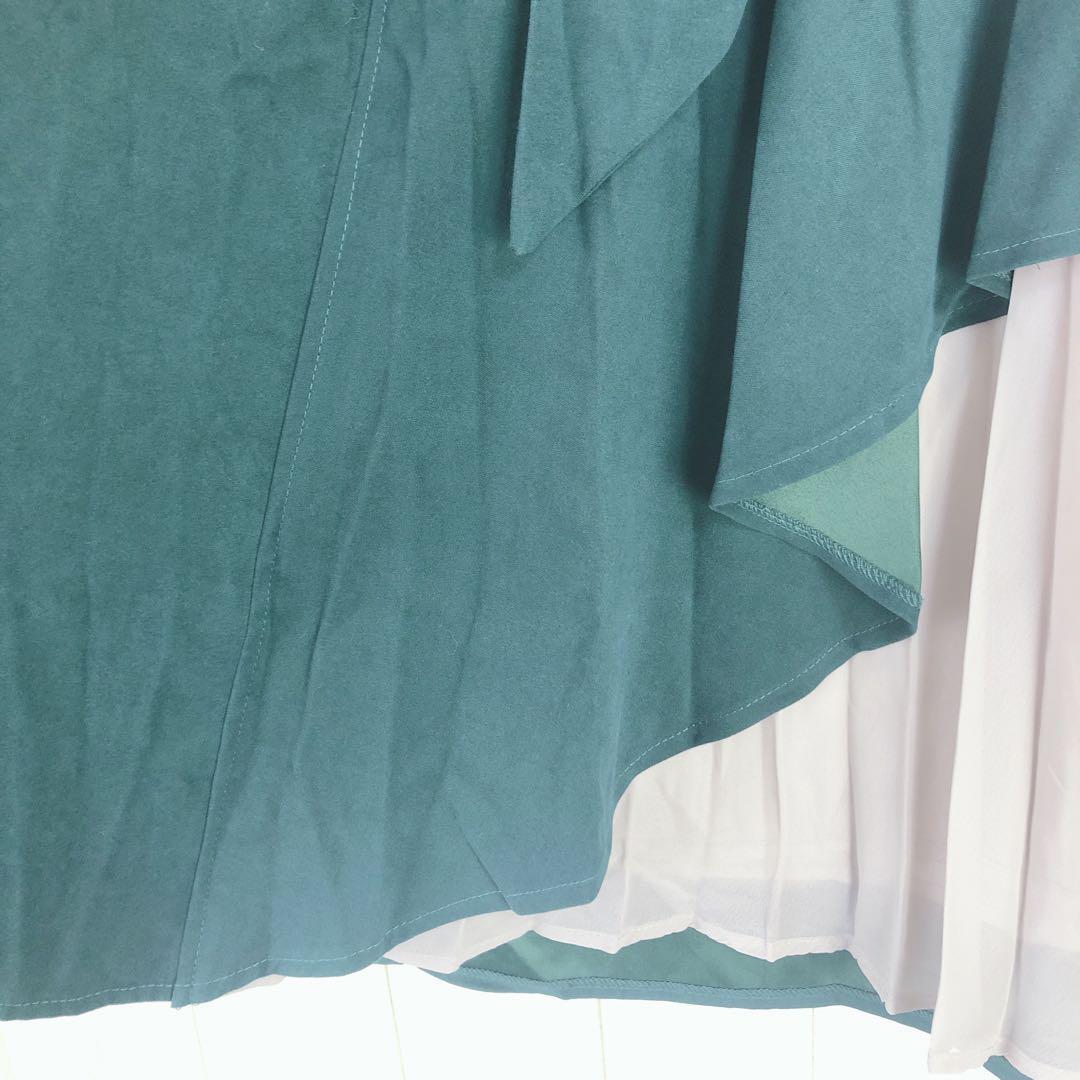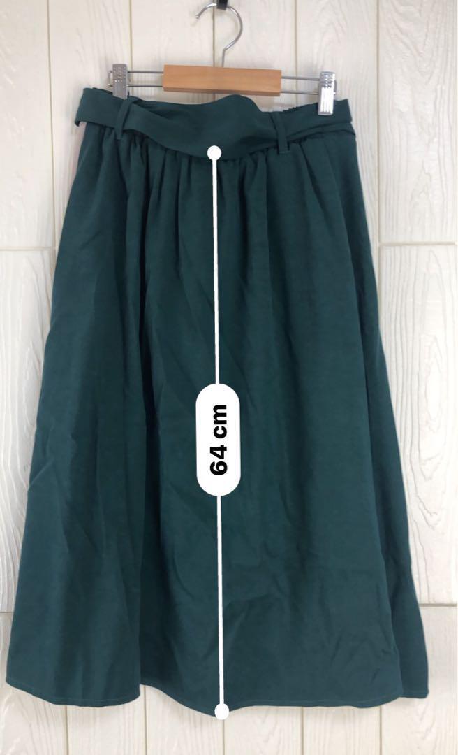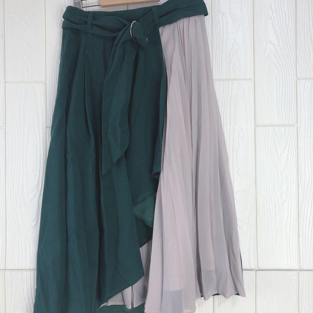グリーンとグレーのコンビネーションが特徴のプリーツスカート。ウエスト67cm、丈64cmで、スタイリッシュなシルエットを演出します。
