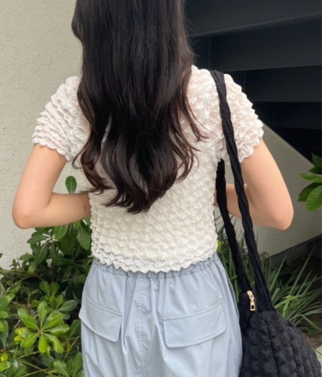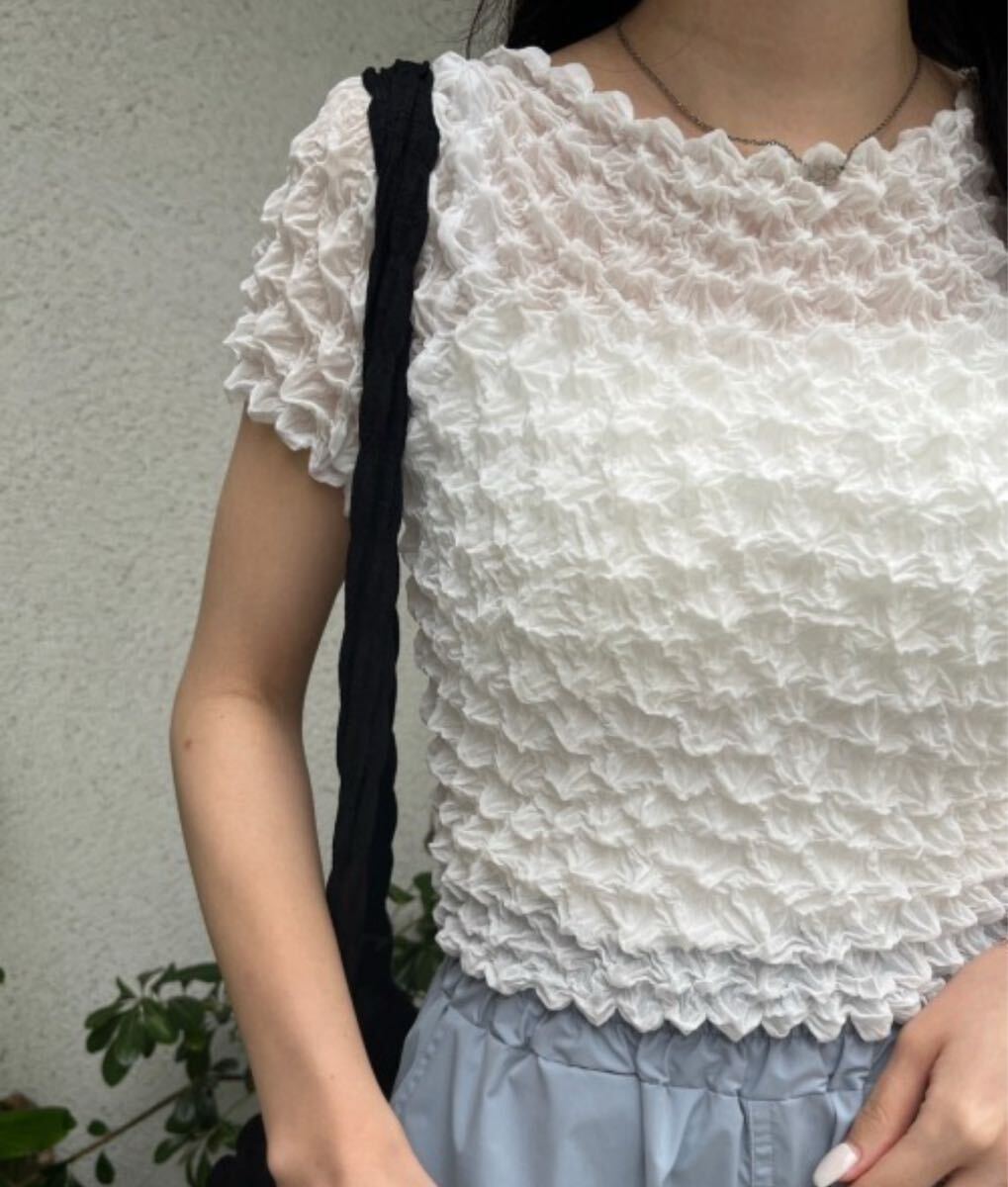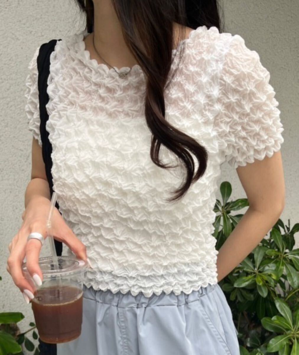 見た目も、着用シルエットも可愛いぽこぽこトップス。ポップコーン素材で表面感がポイント。