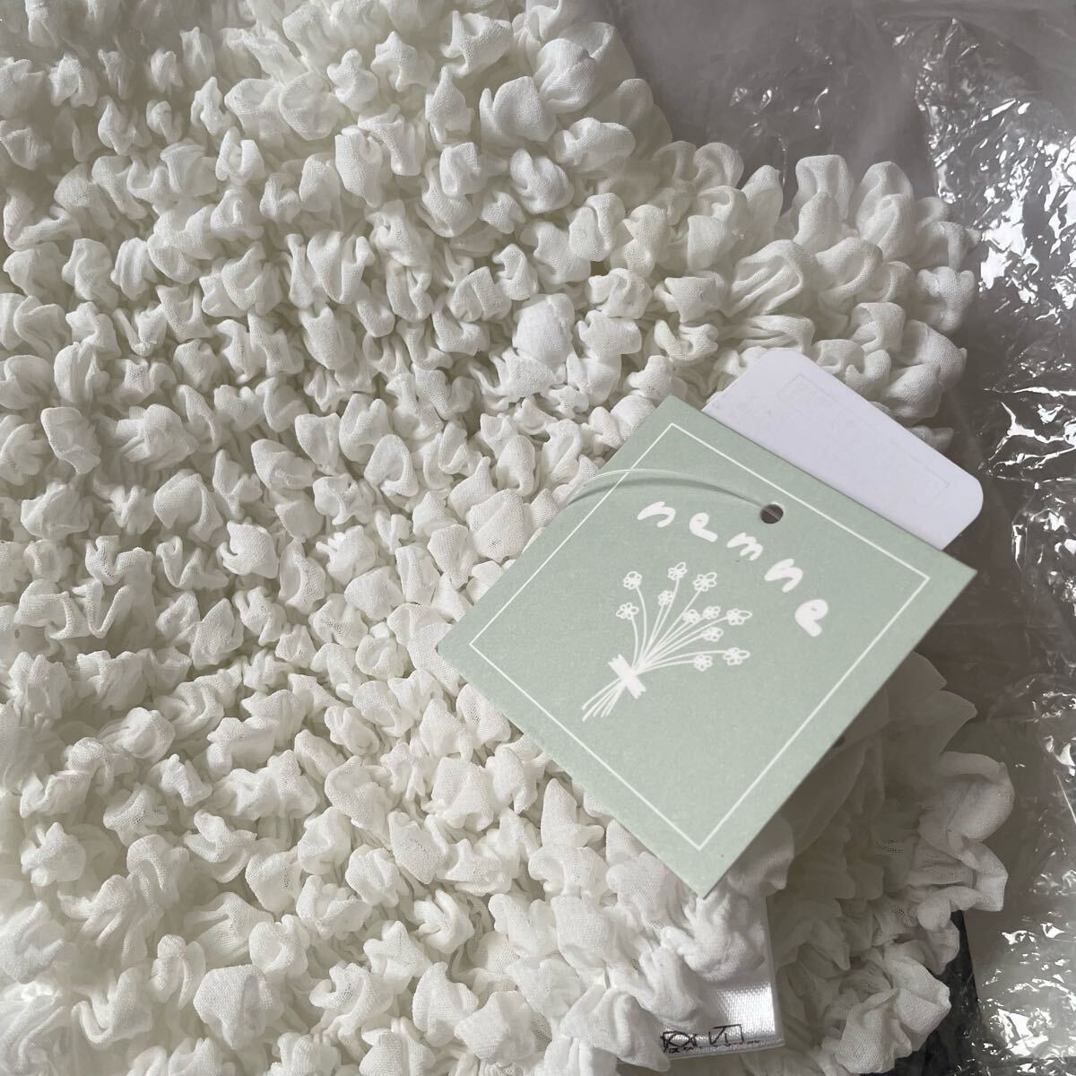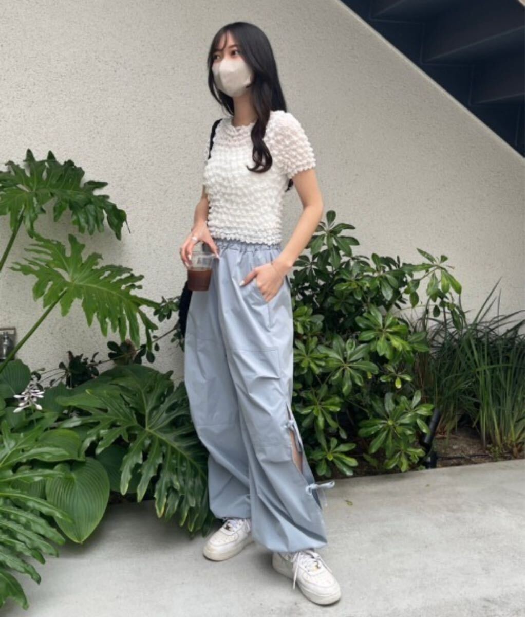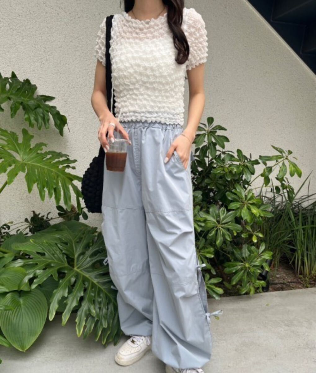 見た目も、着用シルエットも可愛いぽこぽこトップス。ポップコーン素材で表面感がポイント。