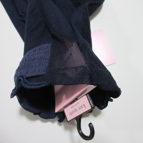 ☆紙タグあり≫新品☆ リボンのうえにロゴビジュー付きそして、 裾部分にメッシュ素材のレースとリボンと同じ素材を使用した2段フリルがおしゃれ可愛いデザインです ・掌メッシュ ●素材:甲部>綿100% 平部>ポリエステル100% 装飾品>ポリエステル・綿・ポリウレタン ●実寸(約):23cm ●カラー:ネイビー