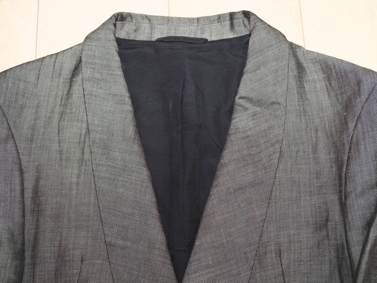 襟はショールカラーでフロントは袷が深い1つボタンです。裏地は総裏地でセンターベンツ、袖は切羽のみ入ったボタンなしのつくりです。