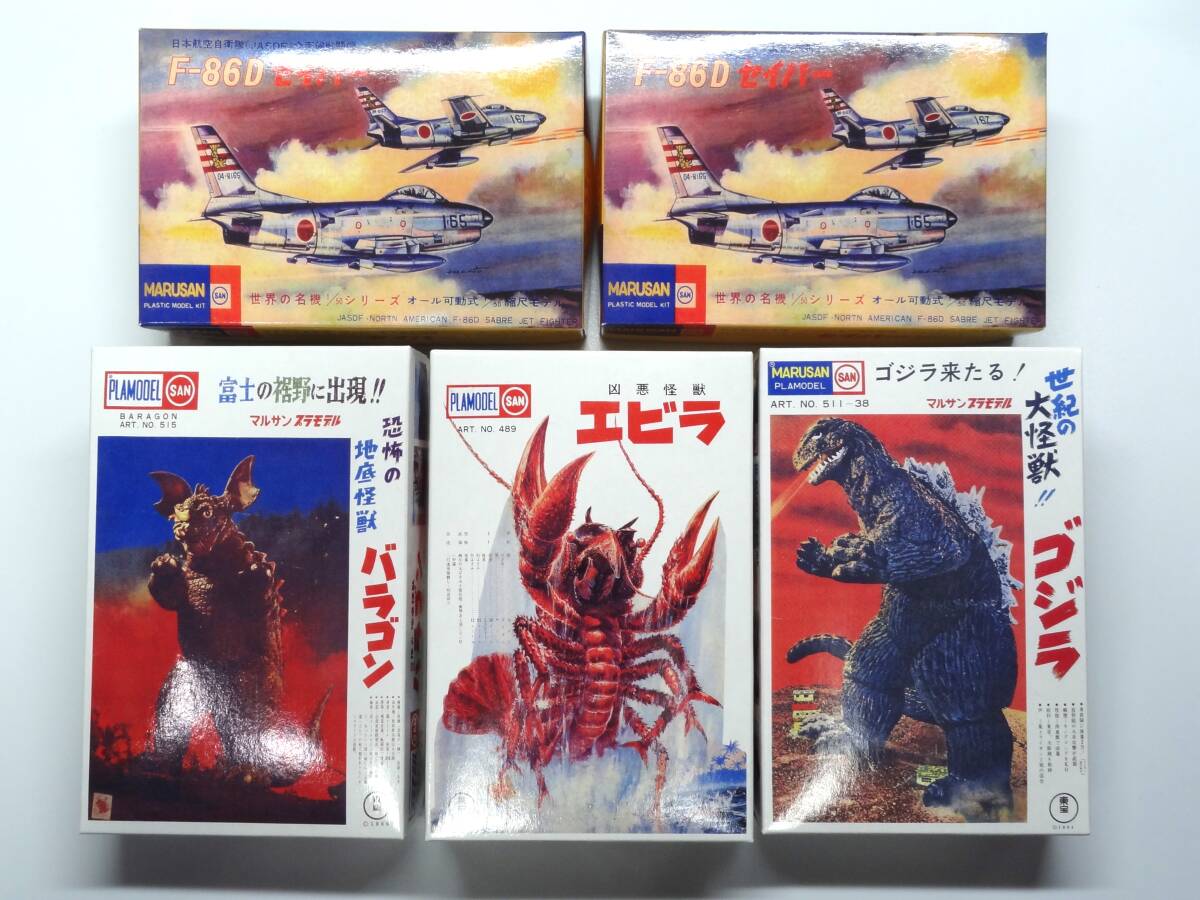 マルサン ミニプラモデル 5種セット 未開封未組み立ての商品です。 F-86Dは彩色済みと色無しの両方があります。 エビラの外箱の一部にヨレがあります。(画像にてご確認ください)その他は良好かと思います。 コレクション等に是非ご活用くださいませ。 よろしくお願いいたします。 | |